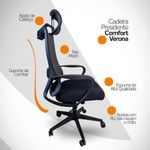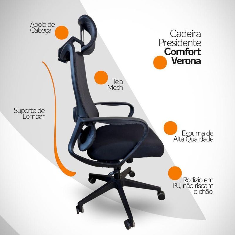 Kit 2 Cadeiras Presidente Oficial Comfort Verona Com ApoioCadeira Presidente Oficial Comfort VeronaDesign ergonômico, conforto inteligente e estilo profissional.Projetada para quem exige conforto e postura durante longas horas de trabalho, a Cadeira Comfort Verona entrega ergonomia de ponta, materiais de qualidade e visual moderno.O encosto é revestido em tecido Mesh Premium, composto por 64% de poli elastômero e 36% de poliéster. Já o assento conta com espuma 35D, revestida em tecido 100% poliéster.Atende aos requisitos da NR-17. Além disso, possui o cobiçado selo BIFMA de qualidade, garantindo durabilidade e desempenho excepcionais!Garantia de 2 anos!Diferenciais do Produto:Encosto com curvatura em “S” – Segue a anatomia da coluna, oferecendo suporte lombar natural. Apoio de cabeça multi-regulável – Ajuste de altura e ângulo para aliviar tensões cervicais. Apoio de braços fixos – Em PP virgem com fibra de vidro, alta resistência e acabamento sofisticado. Assento anatômico – Espuma moldada de alta resiliência Mecanismo butterfly – Curso médio de 25 mm, flexível e confiável. Pistão a gás preto #85 – Curso de 40 mm para ajuste de altura suave. Base em nylon Ø 320 mm – Leve, resistente com fibra de vidro. Rodízios de nylon Ø 55 mm – Movimentação fluida e silenciosa. Dimensões Aproximadas:Altura total: 100 a 110 cm Altura do assento até o chão: 34 a 50 cm Largura entre braços: 59 cm Largura do assento: 49 cm Profundidade do assento: 51 cm Altura dos braços: 28 cm Distância entre os pés: 67 cm Altura do encosto (com apoio): 18 cm Largura do encosto (com apoio): 35 cm Ideal para home office, escritórios executivos ou salas de reunião, a Comfort Verona une ergonomia, leveza e elegância em uma só cadeira.Conforto e produtividade ao seu alcance com a Comfort Verona.