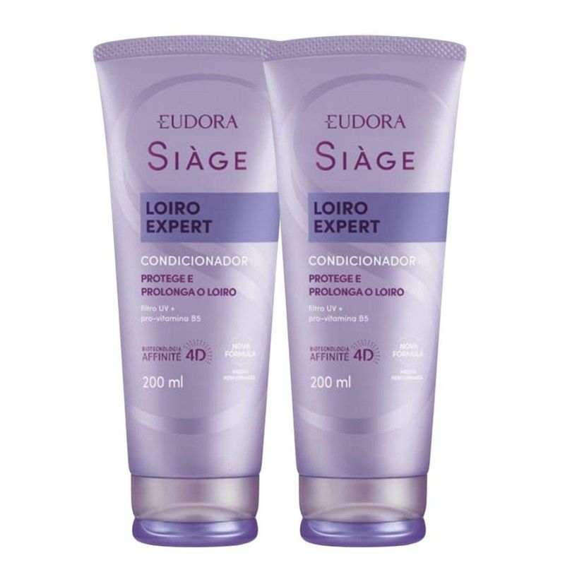 Kit 2 Condicionador Matizador Loiro Expert Roxo Desamarelador Violeta Platinado 200ml Eudora SiàgeKit 2 Condicionador Matizador Loiro Expert Roxo Desamarelador Violeta Platinado 200ml Eudora SiàgeO Condicionador Desamarelador Siàge Loiro Expert entrega o melhor tratamento para seus fios descoloridos.Sua fórmula enriquecida com Filtro UV e Pro-Vitamina B5 protege os fios da exposição solar e hidrata intensamente os cabelos sem deixar que eles percam o movimento, garantindo madeixas leves, radiantes e bem cuidados por muito mais tempo.Confira seus benefícios:-Protege e aumenta a durabilidade do loiro por até 2 meses;-Protege os cabelos contra a oxidação e alteração de tons;-Restaura a elasticidade e resistência do fio;-Repara a hidratação perdida durante a química.O Condicionador Desamarelador garante cabelos super macios e com muito mais brilho.SOBRE A LINHAUma linha completa de tratamento para quem desejar ter seus loiros iluminados e protegidos. Proporcionando mais brilho e proteção desde a primeira aplicação, Siàge oferece por meio do Loiro Expert uma cor intensa e radiante por muito mais tempo. Perfeita para cabelos com luzes, mechas ou tingidos, essa linha completa une alto poder antioxidante e hidratação para preservar a cor de cada um dos seus fios.Nenhum produto Eudora é testado em animais, ou seja, este item possui selo Cruelty Free.Condicionador Matizador Loiro Expert Roxo Desamarelador Violeta Platinado 200ml Eudora SiàgeCódigo: 119871Referênica: 2620Marca: EudoraMaterial: CondicionadorCor: IncolorDimensões do produto (AxLxC): 18,00x4,50x7,50cm cada unidadeQuantidade: Kit com 2 unidades