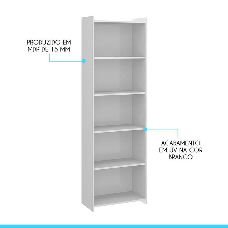 Kit 2 Estantes Para Livros Multiuso Com 5 Prateleiras Menu Móveis BrancoA Estante Prateleira é um móvel útil e versátil, perfeito para complementar o seu ambiente. Possui quatro prateleiras para você organizar seus livros e decorações, além de poder utilizar em diversos cômodos como quarto, sala, escritório. A Estante é produzida com materiais de excelente qualidade, garantindo a durabilidade e vida útil. O melhor em móveis no design atual aliando conforto, qualidade e ótimos preços, só na Menu Móveis!CARACTERÍSTICAS TÉCNICAS:- Produzido em MDP de 15 mm- Acabamento UV na cor Branco- Nichos com Larg. 54 x Alt. 33,2 cm- Prateleiras Suporta 5 Kg*Kit Composto por DUAS EstantesINFORMAÇÕES TÉCNICAS:Altura: 183 cmLargura: 57 cmProfundidade: 30 cmPeso: 22,5 kgINFORMAÇÕES ADICIONAIS:- ATENÇÃO: Não trabalhamos e não nos responsabilizamos pela montagem do móvel. Antes da montagem conferir se o produto está de acordo com o que comprou, produto montado e danificado pela montagem não será aceito troca. Montagem e instalação por conta do comprador.- As imagens ambientadas são meramente ilustrativas e podem apresentar itens que não compõe o produto. As cores do produto podem variar de acordo com o monitor, a iluminação do ambiente ou sua percepção visual.- Limpeza: Deve ser feita com pano macio e seco ou levemente umedecido com água e sabão neutro. Não devem ser utilizados abrasivos como palha de aço e objetos cortantes.Garantia para defeitos de fabricação conforme Código de Defesa do Consumidor.Menu Móveis