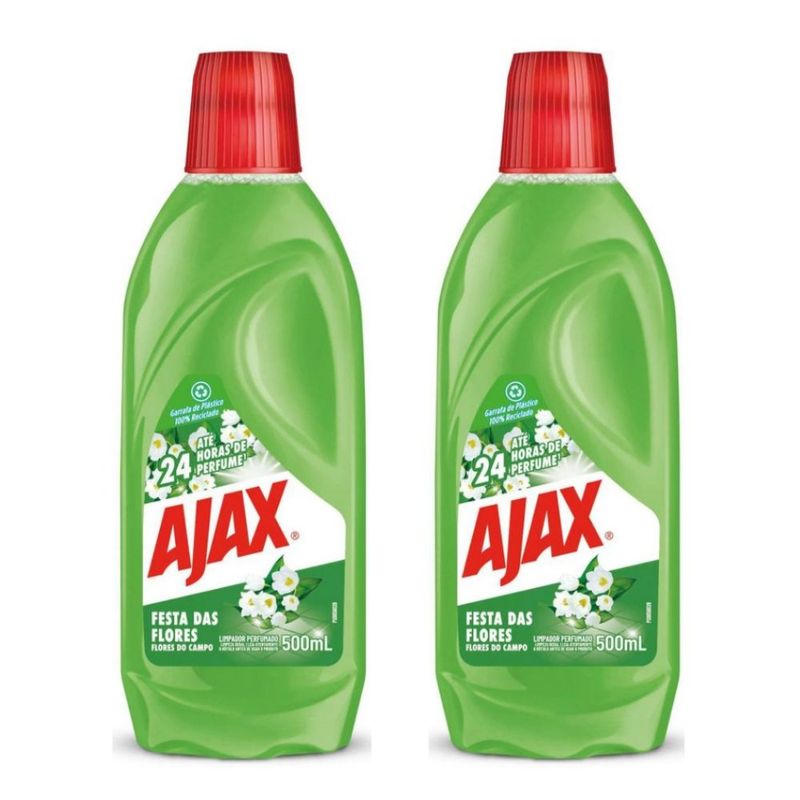 Kit com 2 Limpador Diluível Ajax Festa Das Flores - Flores do Campo 500MlEficiência e Perfume de Longa Duração (até 12 horas). Instruções de uso: Dilua 2 tampas e meia do produto em 5 litros de água, umedeça o pano e passe sobre as superfícies. Rende 30 LitrosCombina a eficiência da limpeza com fragrâncias especiais de flores e perfume de longa duraçãoÉ indicado para pisos, azulejos, vidros, cerâmicas e superfícies laváveis, com delicioso perfume que dura até 24hContém 1 litro (rende até 60 litros)Combinação de limpeza e aroma deliciosoEficácia garantidaLimpeza fácil:Dilua 2 tampas e meia do produto (80 ml) em 5 litros de água. Umedeça o pano e passe sobre as superfícies a serem limpas.Limpeza pesadaSe a limpeza é mais difícil, pode utilizar o produto puro com um pano úmido para remoção das manchas e sujeiras mais difíceis.Garantia 3 Meses