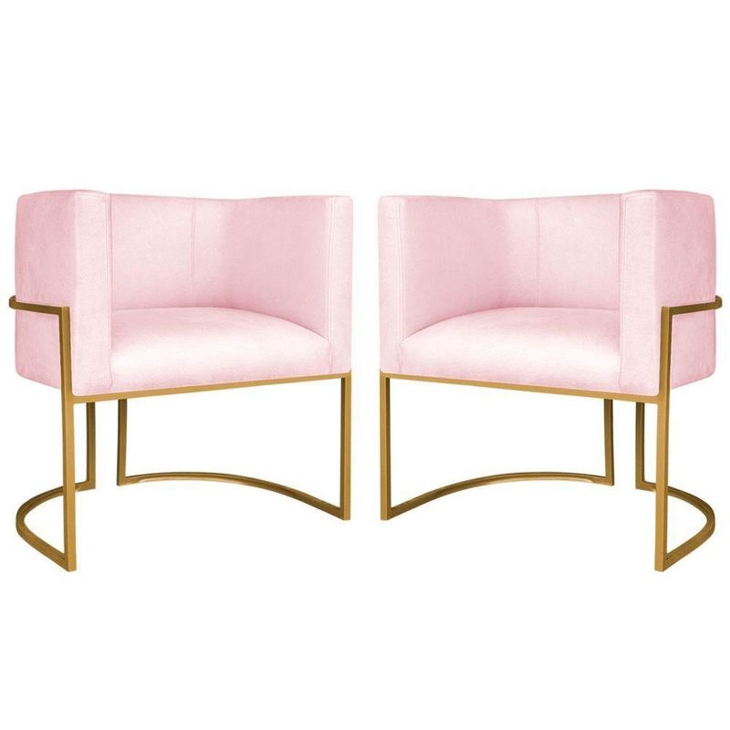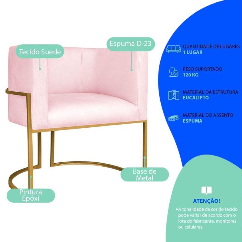 Kit 2 Poltronas Dália Luxo Moderna Estofada Design Sofisticado Com Base De Ferro Dourado Suede Rosa BebêA Poltrona Dália foi criada para unir conforto, estilo e durabilidade em um único design. Seu assento e encosto acolchoados proporcionam conforto ideal para momentos de descanso, enquanto sua base em ferro garante resistência e um toque moderno de luxo. Versátil e sofisticada, a Poltrona Dália é perfeita para compor salas de estar, recepções, escritórios ou qualquer ambiente que mereça charme e requinte.Especificações Técnicas da Poltrona Dália Base de Ferro:- Altura: 80 cm; - Largura: 78 cm; - Profundidade: 62 cm; - Altura do Encosto: 31 cm; - Peso Suportado: 120 kg.Diferenciais da Poltrona Dália Base de Ferro:- Material da Estrutura: fabricado com Madeira Pinus e Eucalipto Reflorestada, e alguns detalhes em MDF; - Detalhes dos Pés: acompanha base de ferro, de alta resistência;Recomendações de limpeza:- Limpar com flanela limpa e seca. - Não molhar o móvel e não expor em lugar úmido ou próximo de fontes de calor. - Não usar produtos abrasivos.Observações Importantes:- As imagens ambientadas são meramente ilustrativas e podem apresentar itens que não compõe o produto; - Objetos decorativos que aparecem na foto não acompanham o produto; - As cores do produto podem variar de acordo com o monitor, a iluminação do ambiente, ou sua percepção visual; - A Poltrona Dália Base de Ferro chegará montada para você; - Confira as dimensões antes da compra e certifique-se de que o produto passará por elevadores, portas e corredores, já que nossa entrega não inclui a subida de lances de escada, ou o lançamento de produtos; - Ao receber seus produtos, verifique no ato do recebimento qualquer dano na embalagem. Caso tenha alguma avaria, favor não assinar o comprovante de recebimento; - Produto para uso residencial em ambiente interno, não devendo ficar exposto diretamente ao sol, calor e umidades excessivas.