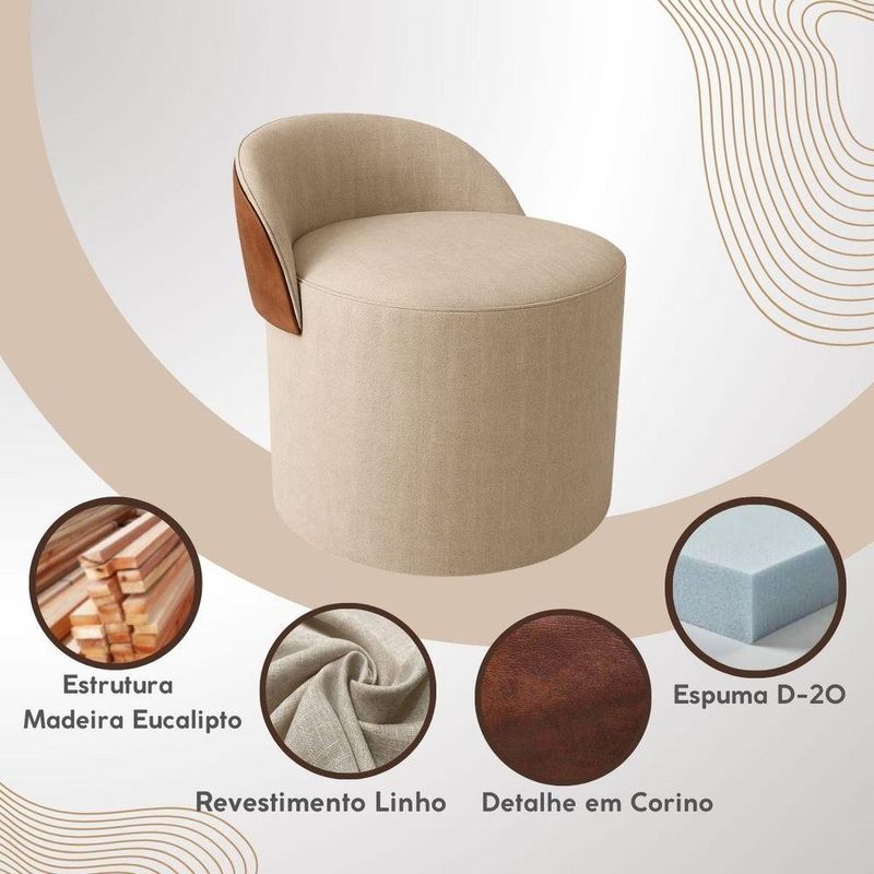 Kit 2 Puff Redondo Orgânico Com Encosto Curvo Confortável Resistente Composé Linho Corino linho CinzaPuff com Encosto – Design Contemporâneo que Une Conforto e SofisticaçãoO puff com encosto foi desenvolvido para quem busca unir design contemporâneo, funcionalidade e alto padrão de acabamento. Seu formato arredondado e linhas suaves trazem leveza ao ambiente, criando uma peça elegante e versátil para diversos estilos de decoração.Produzido com estofamento em linho, ele oferece um toque agradável e sensação de aconchego, ideal para momentos de descanso, apoio ou uso no dia a dia. A parte traseira do encosto recebe um refinamento extra em Corino, que além de valorizar o design, adiciona durabilidade, charme e um contraste sofisticado entre materiais.O encosto curvo proporciona apoio ergonômico e confortável, tornando o puff uma escolha inteligente tanto para decoração quanto para funcionalidade. Seu formato cilíndrico garante estabilidade e presença visual, sendo perfeito para compor quartos, closets, penteadeiras, salas de estar, halls de entrada, áreas comerciais e espaços de beleza.ESPECIFICAÇÕES:Estrutura em madeira de eucalipto, resistente e durável.Assento revestido em linho e Corino de alta qualidade.Design moderno, minimalista e fácil de combinar.Ideal para sala, quartos e penteadeiras.DIMENSÕES:Altura: 65 cmLargura: 50 cmProfundidade: 50 cmPeso: 12 KgEncosto: 10 cmEspuma: Assento D-20Distância assento ao chão: 48 cmVolume: 2MOTAGEM- Produto vai montado.GARANTIA DA FÁBRICACada peça passa por uma curadoria rigorosa que assegura beleza, qualidade e durabilidade. Ainda assim, caso algum produto apresente defeito de fabricação dentro de 90 dias após a entrega, nosso suporte humano, atencioso e altamente profissional estará pronto para atender você com agilidade e eficiência. Valorizamos sua confiança e estamos comprometidos em oferecer soluções rápidas que preservem sua experiência positiva com a marca. Aqui, garantir sua tranquilidade é parte do nosso padrão de excelência.CUIDADOS A LIMPEZA:Utilize um pano limpo e levemente úmido. Indicado para ambientes internos, evite exposição direta ao sol, calor excessivo e umidades.INFORMAÇÕES IMPORTANTES- Pode haver diferença entre a imagem e o produto real devido a tratamento de imagens e calibração do monitor.- Não garantimos a mesma para futuras compras devido à variação em lotes de tecido.- Não inclui objetos de decoração e eletros.- Confira as medidas para garantir que o produto passe por escadas, elevadores e portas.