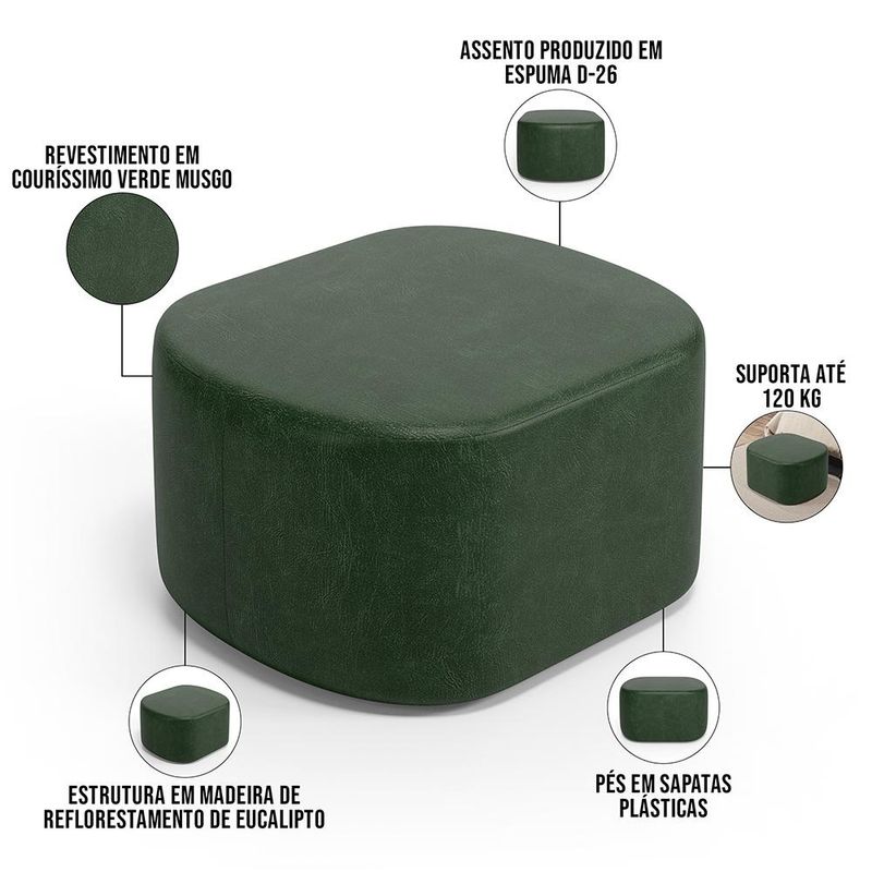 Com um design minimalista, o Puff Decorativo Doha, da Lyam Decor, é sinônimo de modernidade e versatilidade. Com cantos curvos e fluidos, esse puff retangular além de dar um toque de contemporaneidade à decoração, ainda pode ser aproveitado de diversas formas, desde assento extra para a sala de estar à recamier para o quarto, ou ainda como divisor de ambientes para living e outros espaços. Em outras palavras, esse puff orgânico é o complemento perfeito, já que harmoniza facilmente com vários estilos e ambientes, sem contar que oferece conforto e bem-estar. Então, não perca mais tempo e transforme a sua casa com esse puff que transborda beleza e suavidade na medida certa. Adicione agora mesmo ao sei carrinho! Dimensões da Poltrona (L x A x P) 70 x 42 x 60 cm Características: Estrutura em madeira de reflorestamento de eucalipto. Revestimento em Couríssimo na cor Verde Musgo de alta qualidade. Assento com espuma D-26. Peso suportado: Até 120 kg. Pés em sapatas plásticas. - Por se tratar de estofado as medidas podem ter uma pequena variação de até 3 cm. - A tonalidade do produto real poderá ter ligeira variação devido o lote de tecidos. Observações importantes: - Produto para uso residencial em ambiente interno, não devendo ficar exposto diretamente ao sol, calor e umidade excessivos. - Pode haver alguma diferença de tonalidade entre a imagem e o produto real, por conta do tratamento de imagens e a calibração de cores do seu monitor. - As imagens são meramente ilustrativas, não acompanham objetos de decoração e eletrônicos. - Ao receber a mercadoria, o cliente deve verificar as condições da embalagem, caso haja alguma avaria não assine o comprovante de recebimento e entre em contato com nossa loja para orientações. - Montagem, desmontagem e outras instalações serão de responsabilidade do cliente. Não nos responsabilizamos, no ato da entrega, por subir escadas/elevadores ou pelo transporte por guincho em apartamentos. Eventuais despesas são de responsabilidade do comprador. - Confira as dimensões do produto e certifique-se de que passará normalmente por supostos elevadores, portas, escadas e/ou corredores de sua residência. - Para mais informações, acesse nossa Central de Atendimento.