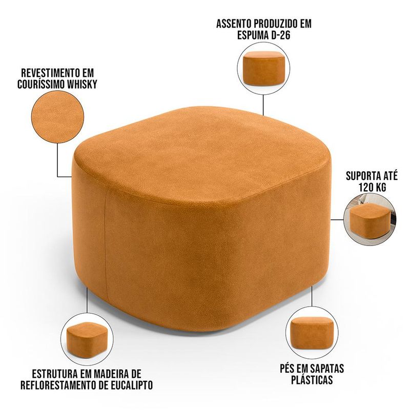 Com um design minimalista, o Puff Decorativo Doha, da Lyam Decor, é sinônimo de modernidade e versatilidade. Com cantos curvos e fluidos, esse puff retangular além de dar um toque de contemporaneidade à decoração, ainda pode ser aproveitado de diversas formas, desde assento extra para a sala de estar à recamier para o quarto, ou ainda como divisor de ambientes para living e outros espaços. Em outras palavras, esse puff orgânico é o complemento perfeito, já que harmoniza facilmente com vários estilos e ambientes, sem contar que oferece conforto e bem-estar. Então, não perca mais tempo e transforme a sua casa com esse puff que transborda beleza e suavidade na medida certa. Adicione agora mesmo ao sei carrinho! Dimensões da Poltrona (L x A x P) 70 x 42 x 60 cm Características: Estrutura em madeira de reflorestamento de eucalipto. Revestimento em Couríssimo na cor Whisky de alta qualidade. Assento com espuma D-26. Peso suportado: Até 120 kg. Pés em sapatas plásticas. - Por se tratar de estofado as medidas podem ter uma pequena variação de até 3 cm. - A tonalidade do produto real poderá ter ligeira variação devido o lote de tecidos. Observações importantes: - Produto para uso residencial em ambiente interno, não devendo ficar exposto diretamente ao sol, calor e umidade excessivos. - Pode haver alguma diferença de tonalidade entre a imagem e o produto real, por conta do tratamento de imagens e a calibração de cores do seu monitor. - As imagens são meramente ilustrativas, não acompanham objetos de decoração e eletrônicos. - Ao receber a mercadoria, o cliente deve verificar as condições da embalagem, caso haja alguma avaria não assine o comprovante de recebimento e entre em contato com nossa loja para orientações. - Montagem, desmontagem e outras instalações serão de responsabilidade do cliente. Não nos responsabilizamos, no ato da entrega, por subir escadas/elevadores ou pelo transporte por guincho em apartamentos. Eventuais despesas são de responsabilidade do comprador. - Confira as dimensões do produto e certifique-se de que passará normalmente por supostos elevadores, portas, escadas e/ou corredores de sua residência. - Para mais informações, acesse nossa Central de Atendimento.