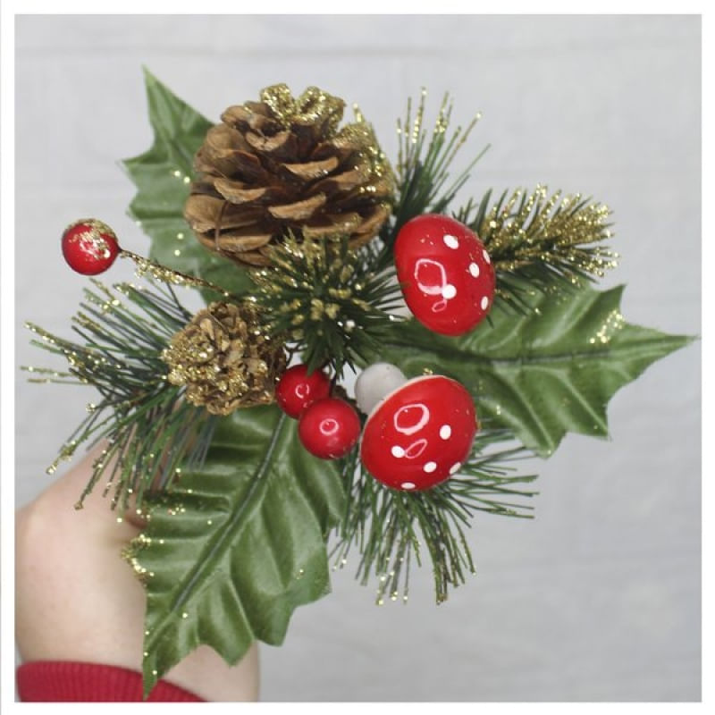 Kit 2 Ramos Cogumelo Decoração De Natal Artificial Com Brilho 16cm - Ideal para seu ambiente, os arranjos artificiais são modernos, versáteis e exóticos, caem bem em Pinheiros e Guirlandas, deixando o seu ambiente ainda mais bonito e elegante. As folhas são reutilizáveis e fáceis de limpar, basta limpar a superfície suavemente com um pano úmido. Mantenha fora do alcance de crianças menores de 3 anos de idade. DETALHES: Possui 2 Ramos, com 2 Cogumelo, 2 Pinhas, Cada peça. Altura: 16 cm Cor: Verde, Vermelho. Material: Plástico, Isopor. Características Gerais do Produto: • Material: Plástico • Cor: Verde; Vermelho Garantia: • Garantia de fábrica - 1 Mês