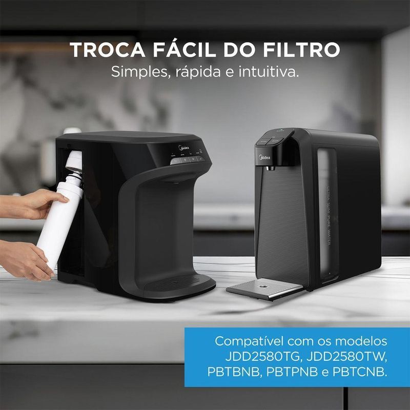 Kit 2 Refil Filtro Purificador De água Midea Fpbtnb Original Classe CGaranta água filtrada com qualidade por muito mais tempo com o Kit contendo 2 Refis Originais Midea. Ideal para quem busca praticidade e economia, mantendo sempre um refil reserva para a próxima troca.O filtro realiza filtragem eficiente em 2 etapas, removendo impurezas da água e reduzindo o cloro livre, proporcionando mais saúde e segurança para você e sua família. Produto testado conforme a NBR 16098:2012, assegurando desempenho e confiabilidade.A substituição é simples e rápida, sendo recomendada a troca a cada 6 meses ou 3.600 litros de consumo (o que ocorrer primeiro). Para melhor conservação, mantenha o produto em local limpo, seco e longe da luz solar. Consulte o Manual do Usuário para instalação correta.:: Contem 2 Refil.:: Compatibilidade Garantida para os modelos: JDD2580TG, JDD2580TW, PBTBNB, PBTPNB e PBTCNB da Midea.:: Retenção de partículas -Classe C (de 5 µm até 15 µm):: Compatível com modelos -PBTBNB, PBTPNB, PBTCNB:: Redução de cloro livre - Com redução:: Vida Útil - 6 meses:: Garantia do Produto - 90 diasFILTRO PURIFICADOR AGUA CLASSE C (REFIL) FPBTNB