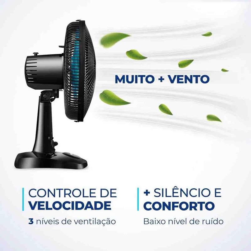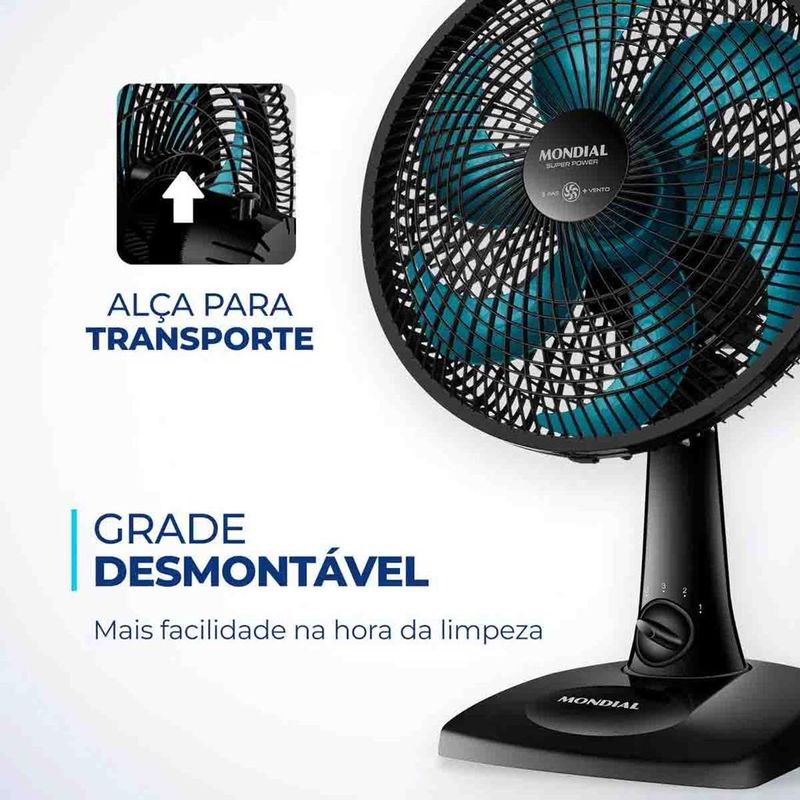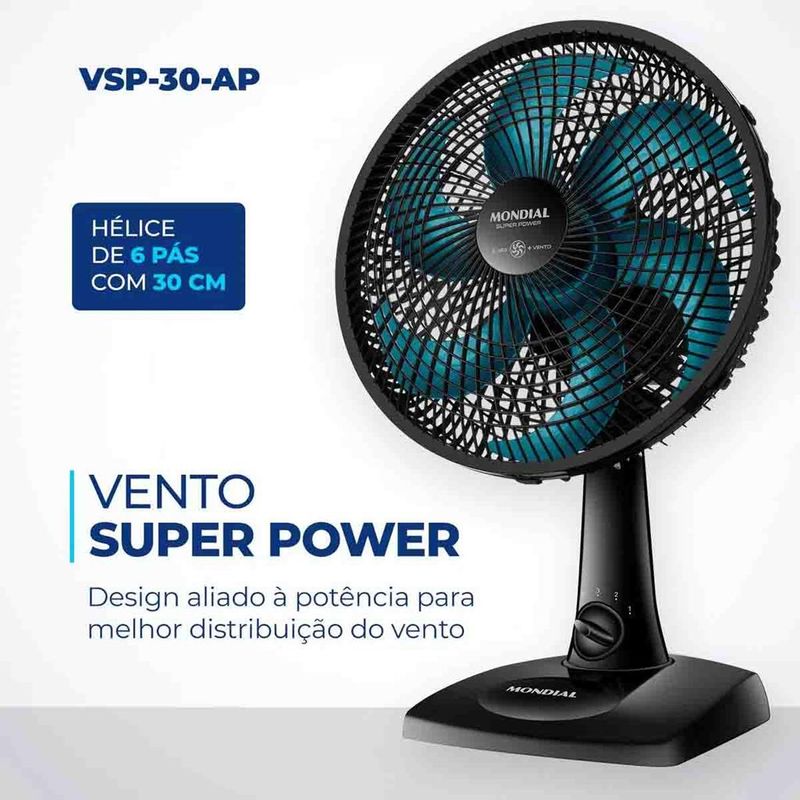 MOBILAR ELETRO HÁ 30 ANOS INOVANDO EM PRODUTOS E ATENDIMENTO KIT 2 VENTILADORES DE PISO OU BANCADA MONDIAL SILENCIOSO 6 PAS TURBO Com 30 CM e 3 VELOCIDADES, o Ventilador branco Super Power VSP-30-AP é mais vento. Ele tem BAIXO NÍVEL DE RUÍDO, SISTEMA OSCILANTE lateral, INCLINAÇÃO VERTICAL REGULÁVEL, além ser compacto e ter baixo consumo. Sua HÉLICE TEM DESIGN AERODINÂMICO, o que proporciona um vento forte. Como ele faz MENOS BARULHO, com qualquer uma das 3 VELOCIDADES, você dorme com ventinho e silêncio garantidos. Para AMBIENTES MAIS AMPLOS, você pode usar seu SISTEMA OSCILANTE. Já sua INCLINAÇÃO VERTICAL REGULÁVEL DIRECIONA O FLUXO DE AR para cima ou para baixo. Como a GRADE FRONTAL É REMOVÍVEL, ele ainda é FÁCIL DE MONTAR e desmontar para limpeza. Ele também é FÁCIL DE CARREGAR porque tem uma alça para transporte. Já a BASE ANTIDERRAPANTE traz mais segurança. O Ventilador 30cm Super Power VSP-30-AP foi desenvolvido para USO DOMÉSTICO, sendo melhor para uso residencial. Tudo isso com 1 ANO DE GARANTIA MONDIAL. A Mondial é a escolha de milhões de consumidores. Cor Preto/Azul Voltagem (Tensão) Preto/Azul Petróleo Itens inclusos 01 Ventilador e 01 Manual de Instruções Potência 60W Dimensões do produto 51,00x35,00x28,00 Número de velocidades 3 Quantidade de pás 6 Coluna ajustável * Tipo de ventilador Ventilador de mesa Peso 1,60 Inclinação regulável Sim Oscilante Sim Garantia 1 Ano