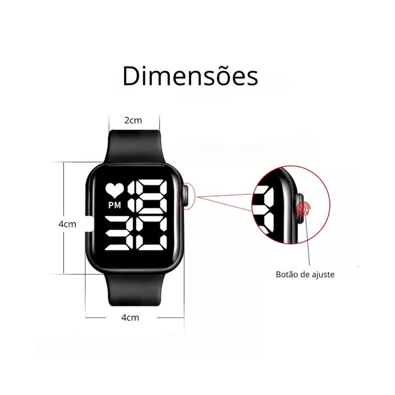 Kit 20 Relógio Digital com Bracelete Esport Com design Lindo e cheio de estilo este Relógio Digital é uma escolha ideal para as pessoas que dividem seu tempo entre trabalho, atividades esportivas e lazer, levíssimo, o relógio digital possui pulseira em silicone maleável, de várias cores para você trocar e combinar com tudo a sua volta. Além de tudo, possui Led's com numeros grandes, que facilitam a visualização das Horas. Especificações Estilo do relógio: Casual/Moda/Popular/Esportes Resistente à água, resistente a choques Pode espirrar um pouco de água, não pode ser lavado ou no banho, natação, mergulho. Uso: Diário Forma do mostrador: Quadrado Tipo de movimento: LED Tipo de exibição: Digital Materal Pulseira: Silicone Tipo de fecho: Pressão Cores Sortidas Modo de uso: Primeiro acenda a tela do relógio apertando apenas uma vez o botão lateral, depois de soltar, aperte novamente e mantenha-o pressionado até o número de cima (hora) começar a piscar - nesse momento você apertará algumas vezes esse botão até encontrar a hora desejada e em seguida basta manter pressionado novamente para fazer a alteração dos minutos. Quando finalizar fará o mesmo processo para alterar a data – vale lembrar que nesse relógio a data é mostrada no padrão americano, ou seja, mês em cima e dia abaixo. O que vem na embalagem - 20 unidades do Esport Led Pro Atenção! Cores enviadas de acordo com disponibilidade
