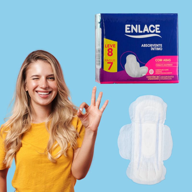 Kit 24 Absorventes Íntimos Enlace com Abas – Conforto e Proteção Todos os DiasMantenha-se protegida e confortável com o Kit 3 pacotes de Absorventes Íntimos Enlace com Abas. Desenvolvido para oferecer máxima segurança, cada absorvente possui cobertura suave, ideal para evitar irritações e proporcionar uma sensação agradável ao toque.O formato anatômico se adapta perfeitamente ao corpo, garantindo discrição e liberdade de movimento durante o dia e a noite. As abas laterais fixam o absorvente na posição correta, prevenindo deslocamentos indesejados e vazamentos.Cada embalagem contém 8 unidades, totalizando 24 absorventes no kit, ideal para manter seu estoque sempre pronto para qualquer necessidade.Benefícios:Cobertura suave para maior conforto e frescorFormato anatômico que se ajusta ao corpo Abas de fixação para melhor aderência e segurançaAlta absorção para proteção prolongadaKit econômico com 3 pacotes de 8 unidades cadaEscolha Enlace e tenha a tranquilidade de um absorvente confiável para o seu dia a dia!