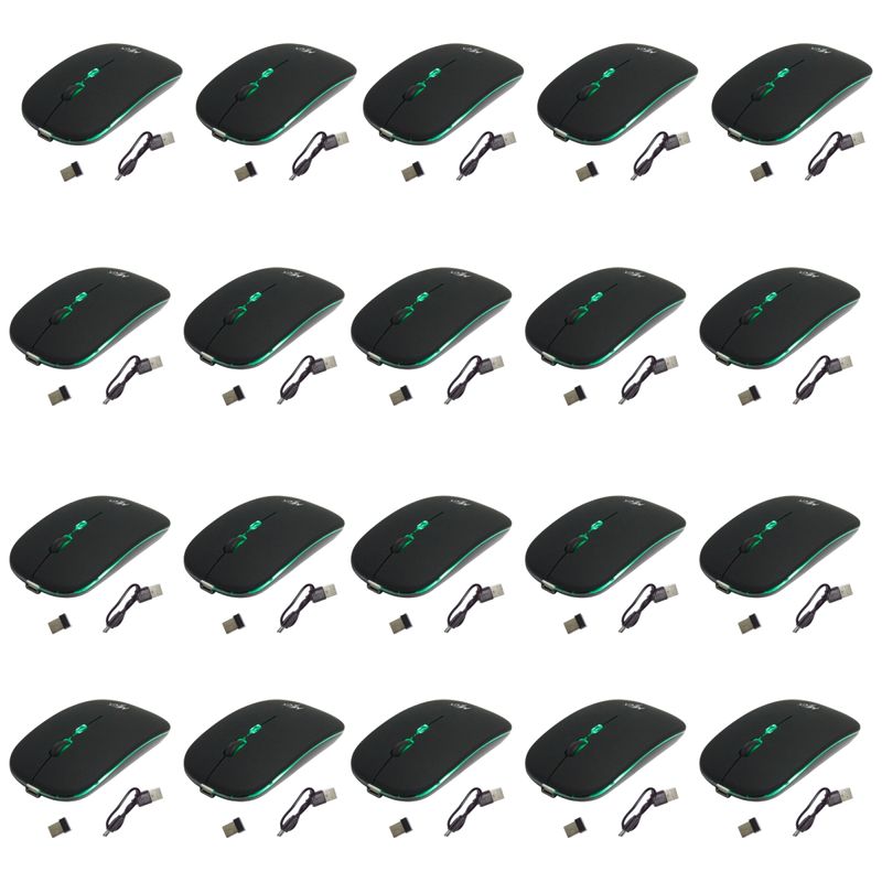 Kit com 25 Mouses Sem Fio Recarregável Mega M185 com Led DPI AjustávelO Mouse Sem Fio Recarregável Mega M185 foi desenvolvido para oferecer praticidade, precisão e conforto no uso diário. Com design moderno no estilo office e retroiluminação Rainbow backlight, é ideal para trabalho, estudos ou lazer, garantindo liberdade de movimentos com sua tecnologia sem fio de 2.4GHz.Possui DPI ajustável (800 / 1200 / 1600), que permite regular a sensibilidade de acordo com a necessidade, além de rastreamento óptico preciso. Seu formato ambidestro proporciona conforto tanto para destros quanto para canhotos.O modelo conta com bateria recarregável de 300mAh, que garante até 1 mês de autonomia com apenas 3 horas de carregamento, utilizando porta de carregamento Micro USB. Leve e compacto, é ideal para quem busca eficiência e praticidade.Especificações- Marca: Mega- Cor: Preto- Modelo: M185- Tipo: Mouse sem fio recarregável- Estilo: Office- DPI Ajustável: 800 / 1200 / 1600- Método de rastreamento: Óptico- Superfície de trabalho: Qualquer superfície (exceto vidro)- Orientação: Ambidestro (ambos os lados)- Número de botões: 4D- Iluminação: Rainbow Backligh- Tecnologia sem fio: 2.4 GHz- Distância sem fio: até 10m- Compatibilidade: PC e Notebook (Windows ME/2000/XP/Vista/7/8, MacOS X ou posterior)- Peso: 68g- Bateria: 300mAh Li-ion- Porta de carregamento: Micro USB- Tempo de carregamento: cerca de 3h- Tempo de uso: até 1 mês- Vida útil das teclas: 5.000.000 cliquesConteúdo da Embalagem Individual- 1 Mouse Sem Fio Recarregável Mega M185- 1 Receptor USB- 1 Cabo de carregamento Micro USB*Imagens meramente ilustrativas
