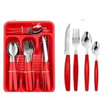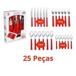 Kit 25 Peças Jogo De Talheres De Mesa Plástico E Aço Inox VermelhoEscolha perfeita para quem busca aliar praticidade, durabilidade e um toque de cor à rotina na cozinha ou na mesa de jantar. Composto por 25 peças de alta qualidade, o conjunto inclui 6 facas com serrilha eficiente, 6 garfos com excelente acabamento, 6 colheres de mesa ideais para refeições , 6 colheres de chá perfeitas para sobremesas e bebidas, além de uma bandeja organizadora que facilita o armazenamento e mantém tudo em ordem.Os talheres possuem cabos ergonômicos na cor vermelha, que proporcionam firmeza e conforto durante o uso, além de um visual moderno e vibrante que combina com qualquer tipo de decoração. Fabricados com materiais resistentes e duráveis, são ideais tanto para uso doméstico quanto para restaurantes, bares, lanchonetes ou qualquer ambiente que exija praticidade sem abrir mão da elegância. Com o Jogo de Talheres, suas refeições ganham mais estilo, funcionalidade e organização. Garanta já o seu e transforme sua experiência à mesa!Itens Inclusos:-06 Faca-06 Garfo-06 Colher Mesa-06 Colher de Sobremesa-01 BandejaEspecificações:Dimensões:Faca: 20cm altura x 1,5cm diâmetroGarfo: 18,5cm altura x 2,5cm diâmetroColher de Mesa: 18cm altura x 4cm diâmetroColher de Sobremesa: 14,5cm altura x 3cm diâmetroBandeja: 4cm altura x 4cm largura x 20cm comprimentoComposição: Plástico e Aço InoxPeso: 558gCor: VermelhoContém:01 Jogo de Talheres 25 Peças - Vermelh0