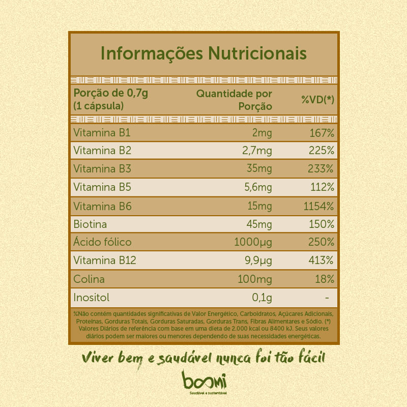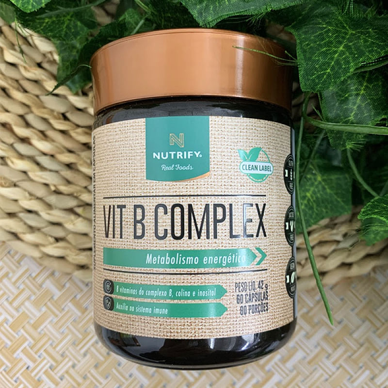 Com todas as vitaminas do complexo B em formas ativas, além de colina e inositol, o Vit B Complex Nutrify 60 Cápsulas promove energia e fortalece o sistema imunológico. O suplemento de vitaminas do Vit B Complex Nutrify 60 Cápsulas é indicado para quem busca melhorar os níveis de energia, reforçar a saúde do sistema nervoso e imunológico, além de prevenir deficiências nutricionais que podem comprometer o bem-estar. Ingredientes: Bitartarato de colina, inositol (Mio-inosito), cloridrato de piridoxina, fosfato de piridoxal, nicotinamida, D-pantotenato de cálcio, riboflavina, cloridrato de tamina, L-metilfolato de cálcio, ácido N-pteroil-L-glutamico, D-biotina, metilcobalamina, estabilizantes celulose microcristalina e hidroxipropilmetilcelulose, lubrificante estearato de magnésio, antiumectante dióxido de silício, glaceante carragena, regulador de acidez acetato de potássio e corante clorofila cúprica. NÃO CONTÉM GLÚTEN. Sobre a marca: A alimentação funcional respeita as necessidades físicas, o estilo de vida e os objetivos de cada indivíduo para fazer uma escolha estratégica dos alimentos e nutrientes mais adequados a cada um deles. NUTRIFY desenvolve seus produtos, seguindo rígidos padrões de qualidade, desde a origem da matéria-prima, passando por todos os processos produtivos até chegar às mãos de consumidores e profissionais de nutrição que acreditam que alimentação equilibrada é parte de um contexto global de bem-estar. Desenvolver produtos saudáveis, saborosos e responsáveis é um trabalho em equipe. Nosso time de consultores em saúde e nutrição conta com profissionais baseados em diversos países. Eles têm a missão de nos conectar aos mais recentes estudos e às novidades em ingredientes e processos, tudo para que possamos fazer, aqui no Brasil, uma linha cada vez mais ampla de produtos que ajudem você a cuidar de sua saúde de modo preventivo para viver mais e melhor. Sobre a Boomi: A Boomi é um mercado online com produtos saudáveis e sustentáveis, que fazem bem à saúde e ao planeta. São mais de 3.500 produtos de 150 pequenas marcas para você! Nascemos pequenos, mas com um propósito gigante: conectar pessoas a produtos acessíveis que tragam benefícios para a saúde, para o planeta e para a sociedade. Para isso, buscamos ofertar produtos de pequenos agricultores e pequenas empresas em um mundo cada vez mais veloz e que busca mais produtividade. Vamos sempre buscar levar o melhor para você! Nosso propósito é conectar alimentos saudáveis e produtos naturais e sustentáveis a pessoas preocupadas com a sua saúde e com a saúde do planeta. Com preço justo, comodidade e informações confiáveis. Curadoria: Nossos produtos são criteriosamente validados pela nossa curadoria de produtos saudáveis, que busca produtores e empresas que compartilham do nosso alto padrão de qualidade. Da enorme lista de ingredientes banidos à preocupação do bem estar animal, desde o primeiro dia seguimos fieis aos nossos valores, trabalhando com transparência e práticas sustentáveis. Vendemos apenas produtos que admiramos e que nos orgulha.