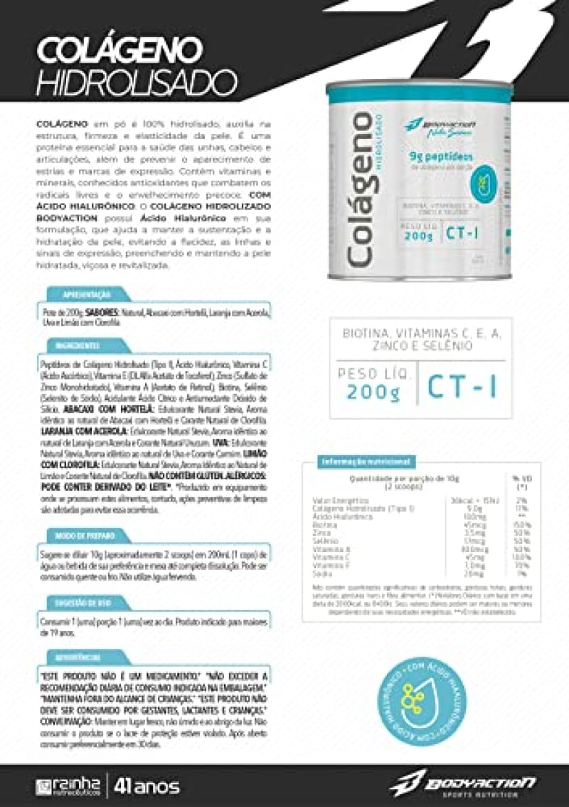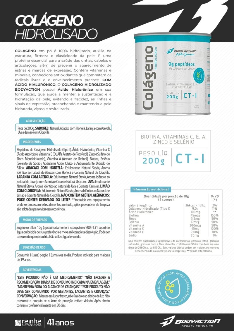 Colágeno VERISOL® O colágeno é uma das proteínas mais importantes do corpo humano, é um componente natural, responsável por dar firmeza à pele e corresponde a aproximadamente 80% do peso seco deste órgão. Durante o processo natural de envelhecimento, em associação com outros fatores ambientais e nutricionais, a derme, principal camada de atuação do VERISOL®, sofre com a perda de umidade e fica mais seca. Por conta disto, ela fica mais fina, a ligação do tecido conjuntivo perde sua firmeza e elasticidade, e as rugas aparecem. VERISOL® é produzido a partir de matérias-primas porcinas, bovinas ou marinhas. O VERISOL® é composto por Peptídeos Bioativos de Colágeno especialmente desenvolvidos para a manutenção da saúde da pele, suavizando a formação de rugas e contribuindo para um aumento da elasticidade e da firmeza deste importante órgão. Ingredientes: Colágeno Hidrolisado, Peptídeos Bioativo de Colágeno Hidrolisado com peso molecular média 2kDa®, Ácido Hialurônico (Hialuronato de Sódio), Coenzima Q10, Silício (Cloreto de Colina), Vitamina C (Ácido Ascórbico), Vitamina E (DL Alfa Acetato de Tocoferol), Zinco (Sulfato de Zinco Monohidratado), Vitamina A (Acetato de Retinol), Biotina (D-Biotina), Selênio (Selenito de Sódio), Antiumectante Dióxido de Silício, Aroma idêntico ao Natural de Abacaxi com Hortelã, Acidulante Ácido Cítrico, Edulcorante Glicosídeo Steviól (Stévia rebaudiana). NÃO CONTÉM GLÚTEN. ALÉRGICOS: PODE CONTER DERIVADO DO LEITE*. *Produzido em equipamento onde se processam estes alimentos, contudo, ações preventivas de limpeza são adotadas para evitar essa ocorrência. Modo de Preparo: Sugere-se diluir 10g (aproximadamente 2 scoops) em 200mL (1 copo) de água ou bebida de sua preferência e mexa até completa dissolução. Pode ser consumido quente ou frio. Não utilize água fervendo. Sugestão de uso: Consumir 1 (uma) porção 1(uma) vez ao dia. PRODUTO INDICADO PARA MAIORES DE 19 ANOS. ADVERTÊNCIAS: ESTE PRODUTO NÃO É UM MEDICAMENTO. NÃO EXCEDER A RECOMENDAÇÃO DIÁRIA DE CONSUMO INDICADA NA EMBALAGEM. MANTENHA FORA DO ALCANCE DE CRIANÇAS. ESTE PRODUTO NÃO DEVE SER CONSUMIDO POR GESTANTES, LACTANTES E CRIANÇAS.