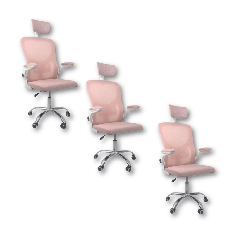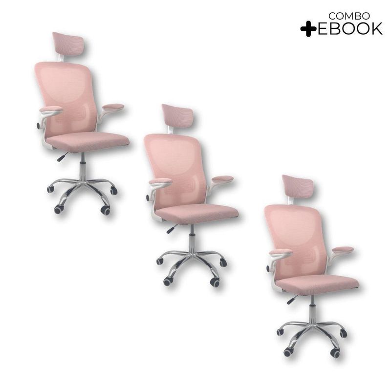 Kit 3 Cadeiras De Escritório Diretor Oficial Vegas Com Apoio Rosa E BrancoCadeira Diretor Vegas – Design, Conforto e Sofisticação para Seu EscritórioA Cadeira Diretor Vegas é a escolha ideal para quem busca elegância, conforto e funcionalidade no ambiente corporativo ou home office. Desenvolvida com design moderno e estrutura resistente, ela oferece suporte ergonômico completo, garantindo bem-estar e produtividade durante longas jornadas de trabalho.Com encosto alto em Tela Mesh respirável, a Vegas proporciona ventilação constante e conforto térmico. Seu sistema de regulagem permite ajustes personalizados, enquanto o acabamento em aço cromado adiciona um toque de sofisticação ao seu espaço de trabalho.Diferenciais do Produto:Design Executivo e Elegante: Combina estilo moderno com acabamento refinado.Encosto Ergonômico: Revestido em tela Mesh respirável, promove conforto e postura adequada.Apoio de Cabeça Ajustável: Suporte cervical para conforto prolongado.Apoio Lombar Integrado: Mantém a postura correta, reduzindo a fadiga.Apoio de Braços Retrátil com Elevação: Versatilidade e praticidade no uso diário.Ajuste de Altura com Pistão a Gás: Personalize a posição ideal de acordo com sua estatura.Base Giratória em Aço Cromado: Alta resistência, durabilidade e um visual sofisticado.Rodas de Nylon Silenciosas: Mobilidade suave e segura em diferentes superfícies.Mecanismo Pneumático de Ajuste: Permite regulagens precisas com facilidade.Extras: Acompanha e-book exclusivo.Especificações Técnicas:Modelo: VegasMarca: Oficial WebshopLinha: DiretorTipo de Cadeira: DiretorMaterial da Estrutura: Aço cromado e polipropileno reforçadoMaterial do Encosto: Tela Mesh respirávelMaterial do Assento: Espuma de alta densidade revestida em tecido poliésterPeso Máximo Suportado: 120 kgRecursos e Funcionalidades:Ergonômica: SimGiratória: SimAjuste de Altura: Sim (pistão a gás)Apoio de Cabeça: Sim (ajustável)Apoio Lombar: SimApoio de Braços: Sim (retrátil e com elevação)Encosto Reclinável: SimRodízios: Sim (nylon silencioso)Dimensões do Produto:Altura Total (mín./máx.): 94 cm a 126 cmAltura do Assento (mín./máx.): 41 cm a 50 cmAltura do Encosto: 60 cmAltura do Encosto de Cabeça: 17 cm (ajustável até 20 cm)Largura do Assento: 46 cmProfundidade do Assento: 48 cmLargura entre Braços: 42 cmLargura Total (braços externos): 68 cmDistância dos Pés: 65 cmCapacidade de Carga: Suporta até 120 kgCuidados e Manutenção:A limpeza pode ser realizada com pano úmido e detergente neutro. Evite produtos abrasivos para preservar o acabamento cromado e a tela Mesh, garantindo maior durabilidade da cadeira.Sofisticação e Conforto para Seu Escritório!Transforme seu ambiente com a Cadeira Diretor Vegas e desfrute de um design ergonômico, moderno e funcional. Ideal para quem busca um produto que alia conforto, praticidade e elegância no dia a dia de trabalho.