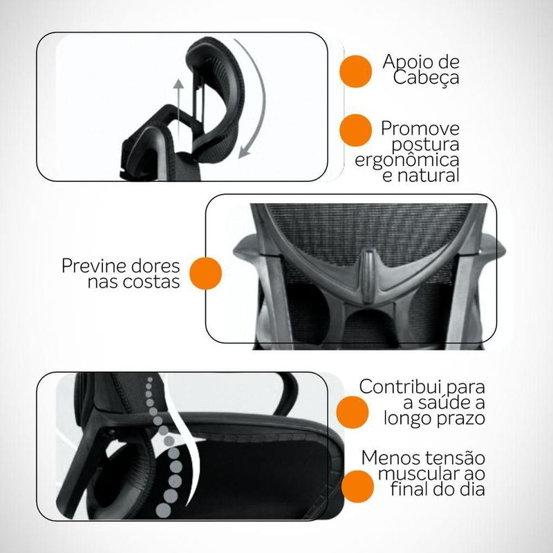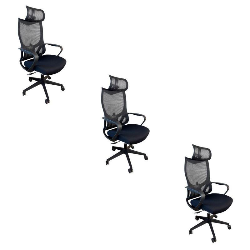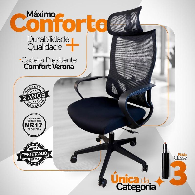Kit 3 Cadeiras De Escritório Presidente Ergonômica Oficial Corporativa Verona Apoio NucaCadeira Presidente Oficial Comfort Verona com Apoio de NucaDesign ergonômico, conforto inteligente e estilo profissional.Projetada para quem exige conforto e postura durante longas horas de trabalho, a Cadeira Comfort Verona entrega ergonomia de ponta, materiais de qualidade e visual moderno.O encosto é revestido em tecido Mesh Premium, composto por 64% de poli elastômero e 36% de poliéster. Já o assento conta com espuma 35D, revestida em tecido 100% poliéster.Atende aos requisitos da NR-17. Além disso, possui o cobiçado selo BIFMA de qualidade, garantindo durabilidade e desempenho excepcionais!Garantia de 2 anos!Diferenciais do Produto:Encosto com curvatura em “S” – Segue a anatomia da coluna, oferecendo suporte lombar natural.Apoio de cabeça multi-regulável – Ajuste de altura e ângulo para aliviar tensões cervicais.Apoio de braços fixos – Em PP virgem com fibra de vidro, alta resistência e acabamento sofisticado.Assento anatômico – Espuma moldada de alta resiliênciaMecanismo butterfly – Curso médio de 25 mm, flexível e confiável.Pistão a gás preto #85 – Curso de 40 mm para ajuste de altura suave.Base em nylon Ø 320 mm – Leve, resistente com fibra de vidro.Rodízios de nylon Ø 55 mm – Movimentação fluida e silenciosa.Dimensões Aproximadas:Altura total: 100 a 110 cmAltura do assento até o chão: 34 a 50 cmLargura entre braços: 59 cmLargura do assento: 49 cmProfundidade do assento: 51 cmAltura dos braços: 28 cmDistância entre os pés: 67 cmAltura do encosto: 18 cmLargura do encosto: 35 cmIdeal para home office, escritórios executivos ou salas de reunião, a Comfort Verona une ergonomia, leveza e elegância em uma só cadeira.Conforto e produtividade ao seu alcance com a Comfort Verona.