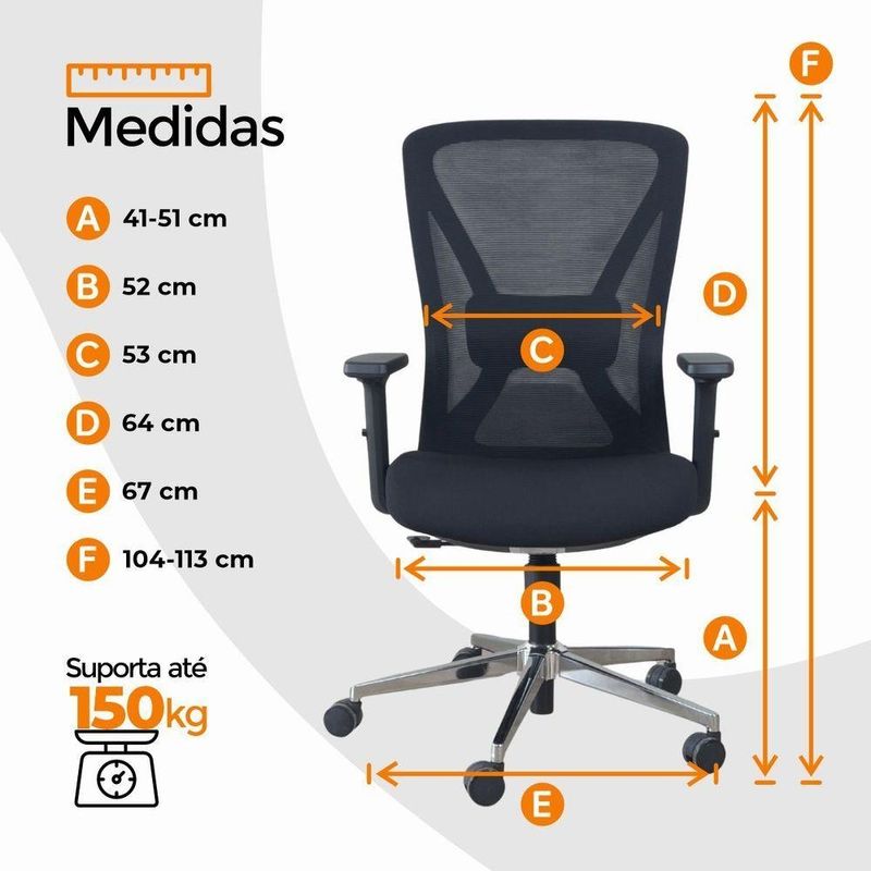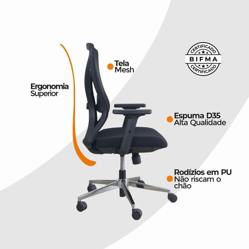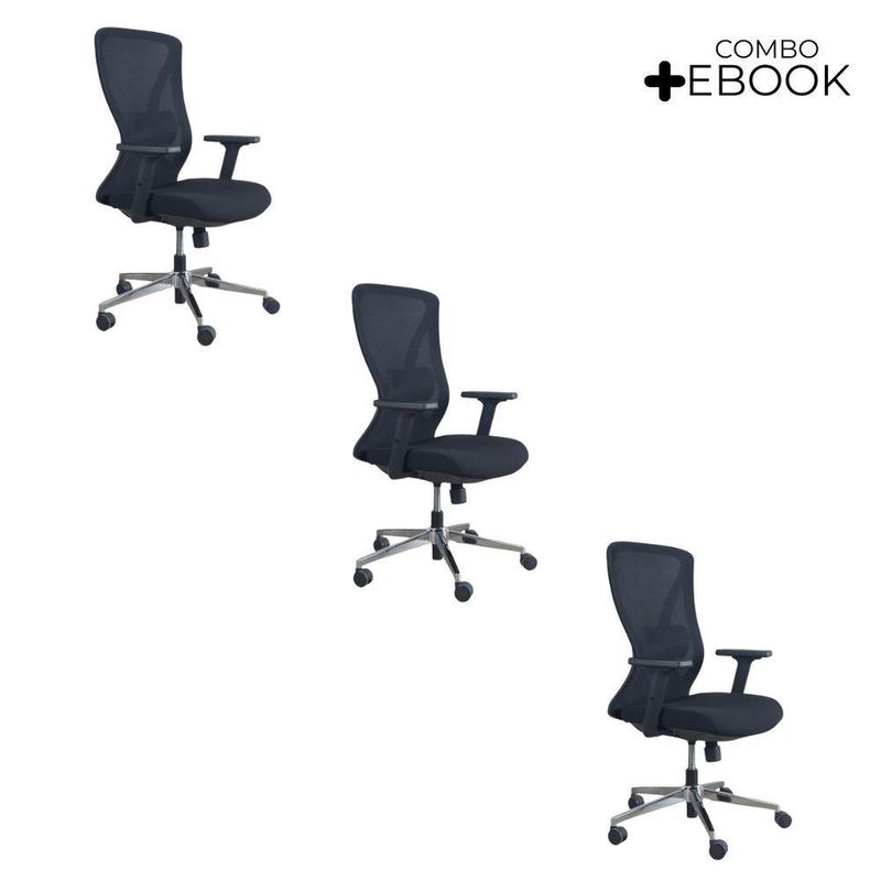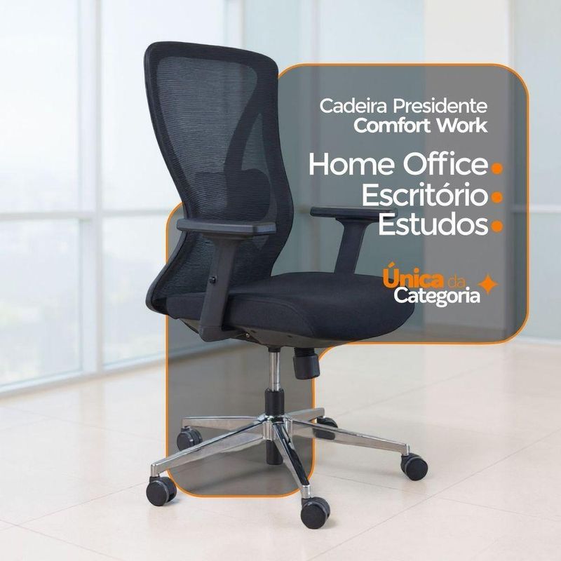 Kit 3 Cadeiras De Escritório Sem Apoio Oficial WorkCadeira Diretor Oficial Comfort Work sem Apoio de cabeçaErgonomia profissional, ajustes inteligentes e estrutura premium.A Comfort Work foi desenvolvida para quem passa longas horas em frente ao computador e precisa de uma cadeira que ofereça conforto real, suporte completo e alta durabilidade. Com múltiplos ajustes, estrutura reforçada e design executivo, ela é perfeita para ambientes corporativos.A inclinação sincronizada é um mecanismo presente em cadeiras e poltronas que permite ao usuário ajustar o encosto e o assento de forma simultânea, proporcionando maior conforto e ergonomia durante o uso. Esse tipo de reclinação é comumente encontrado em móveis de escritório, especialmente em cadeiras de trabalho, onde a postura correta é essencial para evitar dores e lesões musculares.O encosto é revestido em tecido Mesh Premium, composto por 64% de poli elastômero e 36% de poliéster. Já o assento conta com espuma 35D, revestida em tecido 100% poliéster.Atende aos requisitos da NR-17 além disso possui o cobiçado selo BIFMA de qualidade, garantindo durabilidade e desempenho excepcionais.Garantia de 2 anos!Destaques do Produto:Encosto com armação traseira em PP com fibra de vidro, aprovado no teste de tração BIFMA (136 kg), com malha elástica respirável de alta qualidade.Apoio lombar 3D ajustável em altura e profundidade, oferecendo suporte personalizado à região lombar.Braços com regulagem 2D (altura), promovendo conforto e postura adequada.Assento com espuma moldada de densidade média e alta resiliência, oferecendo equilíbrio entre maciez e sustentação.Base com trava de posição e mecanismo de balanço livre, para mais liberdade de movimento.Pistão a gás de 3 estágios, curso de 100 mm, em acabamento preto.Estrutura da base em tubos quadrados eletroplated Ø 350 mm, resistente e elegante.Rodízios em PU Ø 60 mm, silenciosos e ideais para diferentes tipos de piso.Dimensões Aproximadas:Altura total: 104 a 113 cmAltura do assento ao chão: 41 a 51 cmLargura entre braços: 66 cmAltura dos braços: 18 a 27 cmLargura do assento: 52 cmProfundidade do assento: 51 cmDistância entre os pés: 67 cmExtras: acompanha e-book exclusivo.Com estrutura profissional, materiais de alta performance e ajustes ergonômicos, a Comfort Work oferece mais conforto, produtividade e qualidade de vida no seu dia a dia.Seu trabalho merece mais conforto. Escolha a Comfort Work.