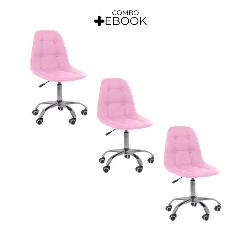 Kit 3 Cadeiras Office Eiffel Botonê Ajustável Oficial RosaCadeira Office Eiffel Botonê Ajustável com Base Giratória – Design, Conforto e Versatilidade para o Seu EspaçoDescubra o equilíbrio ideal entre estilo moderno e conforto ergonômico com a Cadeira Office Eiffel Botonê Ajustável com Base Giratória.Desenvolvida para oferecer elegância e funcionalidade, ela é perfeita para escritórios, home offices, salas de estudo, áreas de lazer e ambientes comerciais.Seu design contemporâneo com estofamento botonê traz um toque sofisticado à decoração, enquanto o assento anatômico e o encosto ergonômico garantem conforto e postura correta mesmo durante longos períodos de uso.Com ajuste de altura e base giratória com rodízios, a Cadeira Eiffel Botonê proporciona mobilidade suave e personalização de uso, adaptando-se facilmente às suas necessidades diárias com praticidade e estilo.A montagem é simples e rápida — acompanha manual de instruções e suporte de atendimento especializado para qualquer dúvida. Diferenciais do ProdutoDesign Sofisticado e Ergonômico: Estilo botonê moderno com curvas anatômicas que garantem conforto e elegância.Ajuste de Altura Personalizado: Permite adaptar a cadeira ao seu biotipo e à altura da mesa.Base Giratória com Rodízios Cromados: Mobilidade fluida e estabilidade em qualquer superfície.Estrutura Resistente e Durável: Produzida em polipropileno (PP) e aço cromado de alta qualidade.Revestimento Premium: Material sintético (PU) de toque suave e fácil limpeza.Versatilidade de Uso: Ideal para ambientes corporativos e residenciais.Montagem Simples: Acompanha manual e suporte pós-venda especializado.Extras: acompanha e-book exclusivo. Especificações TécnicasModelo: Eiffel BotonêMarca: Oficial WebshopTipo de Cadeira: Office / GiratóriaMaterial da Estrutura: Polipropileno (PP) e Aço CromadoRevestimento: Material Sintético (PU)Assento e Encosto: Madeira multilaminada com acabamento botonêBase: Giratória com rodízios e regulagem de alturaPeso Máximo Suportado: 120 kgPeso da Cadeira: 5,5 kg Dimensões do ProdutoAltura Total (mín./máx.): 84,5 cm a 98 cmAltura do Assento (mín./máx.): 44,5 cm a 58 cmAltura do Encosto: 68 cmLargura do Assento: 43 cmProfundidade do Assento: 41 cmLargura da Base (pernas): 47,5 cmEspessura do Encosto: 5 cm Cuidados e ManutençãoLimpe com pano úmido e detergente neutro, evitando produtos abrasivos que possam danificar o acabamento.Evite exposição direta ao sol para preservar a cor, o brilho e a durabilidade do revestimento e da base cromada. Conforto e Estilo em Cada Detalhe!A Cadeira Office Eiffel Botonê Ajustável com Base Giratória combina ergonomia, resistência e elegância em um único design.Ideal para quem busca um ambiente funcional e sofisticado, ela transforma o seu espaço em um local mais confortável, moderno e inspirador.