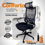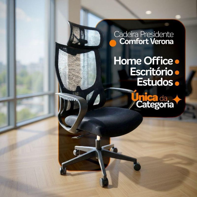 Kit 3 Cadeiras Presidente Oficial Comfort Verona Com ApoioCadeira Presidente Oficial Comfort VeronaDesign ergonômico, conforto inteligente e estilo profissional.Projetada para quem exige conforto e postura durante longas horas de trabalho, a Cadeira Comfort Verona entrega ergonomia de ponta, materiais de qualidade e visual moderno.O encosto é revestido em tecido Mesh Premium, composto por 64% de poli elastômero e 36% de poliéster. Já o assento conta com espuma 35D, revestida em tecido 100% poliéster.Atende aos requisitos da NR-17. Além disso, possui o cobiçado selo BIFMA de qualidade, garantindo durabilidade e desempenho excepcionais!Garantia de 2 anos!Diferenciais do Produto:Encosto com curvatura em “S” – Segue a anatomia da coluna, oferecendo suporte lombar natural. Apoio de cabeça multi-regulável – Ajuste de altura e ângulo para aliviar tensões cervicais. Apoio de braços fixos – Em PP virgem com fibra de vidro, alta resistência e acabamento sofisticado. Assento anatômico – Espuma moldada de alta resiliência Mecanismo butterfly – Curso médio de 25 mm, flexível e confiável. Pistão a gás preto #85 – Curso de 40 mm para ajuste de altura suave. Base em nylon Ø 320 mm – Leve, resistente com fibra de vidro. Rodízios de nylon Ø 55 mm – Movimentação fluida e silenciosa. Dimensões Aproximadas:Altura total: 100 a 110 cm Altura do assento até o chão: 34 a 50 cm Largura entre braços: 59 cm Largura do assento: 49 cm Profundidade do assento: 51 cm Altura dos braços: 28 cm Distância entre os pés: 67 cm Altura do encosto (com apoio): 18 cm Largura do encosto (com apoio): 35 cm Ideal para home office, escritórios executivos ou salas de reunião, a Comfort Verona une ergonomia, leveza e elegância em uma só cadeira.Conforto e produtividade ao seu alcance com a Comfort Verona.