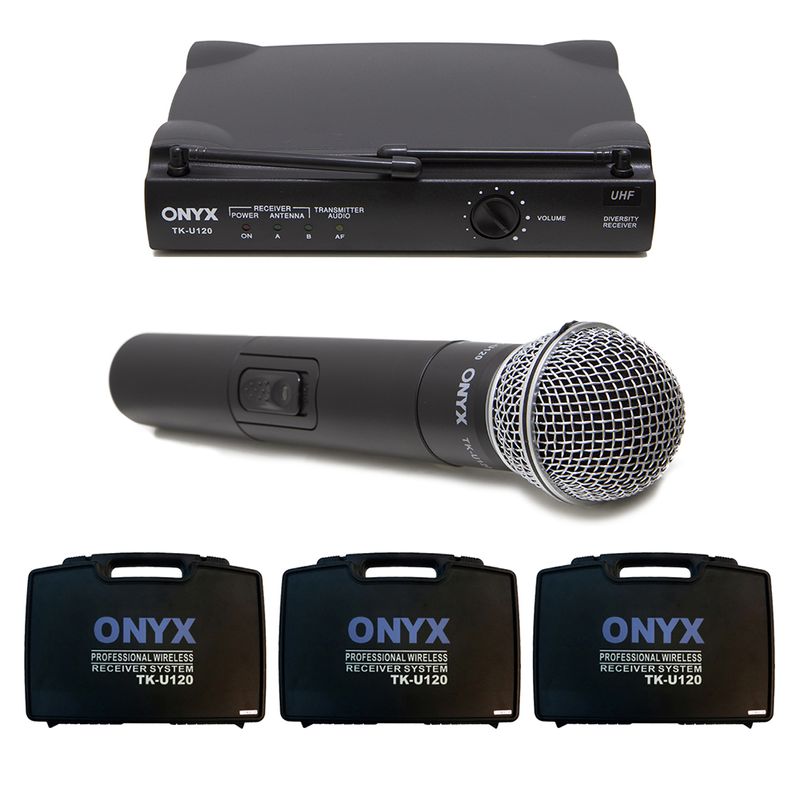 3 Kits de Microfones TK-U120 wireless Onyx, possui ajuste de Squelch, um filtro externo que ajuda eliminar os ruídos indesejáveis numa transmissão, possui saída balanceada (XLR) que são menos suscetíveis a captação de interferências. Especificações - Marca: Onyx - Tipo: Wireless - Modelo: TK-U120 - Frequência: 614 ~ 806 Mhz, Uhf - Resposta de Frequência: 60Hz ~ 13 KHz, 3Db - Relação Sinal/ Ruído 95 Db - Temperatura de Trabalho: -10 a +55 °C Transmissor - Estabilizador de Frequência: +0.01% - Sistema de Modulação: Cristal - Modo de Modulação: FM - Antena 1/4ª - Desvio Máximo: +35KHz - Alimentação: 3.0V (2x1,5V – AA Alcalina) Receptor - Frequência: 614 ~ 806 Mhz, Uhf - Estabilização de Frequência: +0.01% - Sistema de Modulação: Cristal - T.H.D: