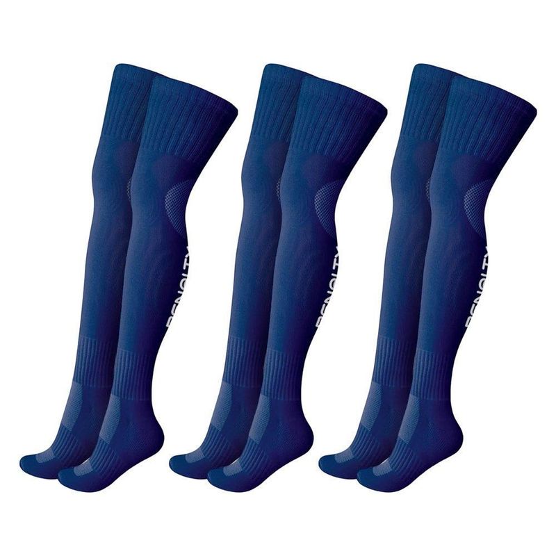 Descrição:O Kit de 3 Pares de Meiões Penalty Matís VIII Masculino é um conjunto de meias ideais para suas partidas de futebol. Seu tecido foi desenvolvido em poliéster, elastano, poliamida e elastodieno. Essa combinação de materiais proporciona durabilidade, elasticidade, conforto e maciez aos meiões. Além disso, traz as tecnologias Float e DryOne, que juntas garantem uma alta respirabilidade e também rápida absorção e evaporação do suor para o exterior do tecido, mantendo os meiões leves e confortáveis durante as partidas. O formato do calcanhar e da ponta foi projetado de maneira anatômica para se ajustar perfeitamente aos pés, oferecendo um encaixe confortável. Com modelagem anatômica, seu design é moldado para se adaptar bem aos pés do usuário, proporcionando conforto durante o uso. A parte da sola é acolchoada com tecido atoalhado, o que transmite maciez e conforto, além de ajudar a evitar a formação de bolhas nos pés durante a prática esportiva. A compressão gradual aplicada nos meiões auxilia na prevenção do desgaste muscular, contribuindo para uma recuperação mais rápida após o exercício físico. Tamanho 39-44 com medidas aproximadas de: 24cm x 50cm x 11cm (Comprimento do pé x Altura do cano x Largura). DESCRIÇÃO Referência: 410770. Composição: 73,5% poliéster, 13,5% elastano, 7% poliamida e 6% elastodieno. Gênero: masculino. Indicado para: futebol. TECNOLOGIAS: Flot: Essa tecnologia proporciona leveza ao meião e favorece a respirabilidade da pele, garantindo o equilíbrio térmico durante as partidas de futebol, proporcionando mais conforto ao atleta. Dryone: Tecnologia que garante rápida absorção e evaporação do suor para o exterior do tecido, mantendo os meiões leves e confortáveis durante as partidas.