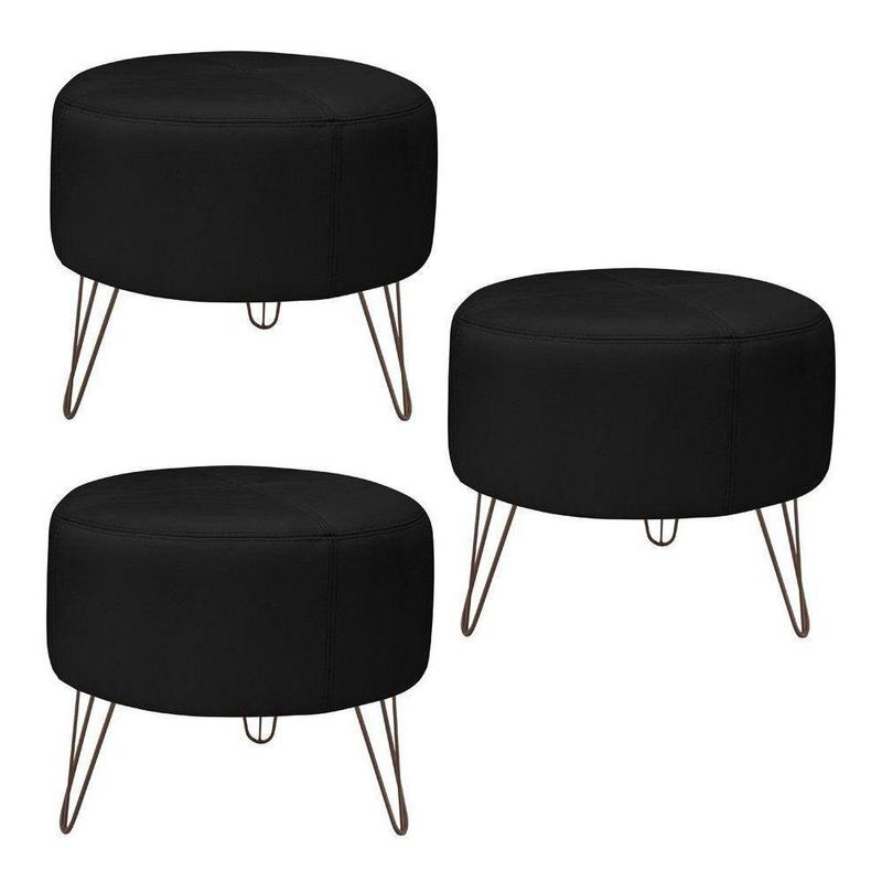 Kit 3 Puffs Decorativos Redondo Couro Preto