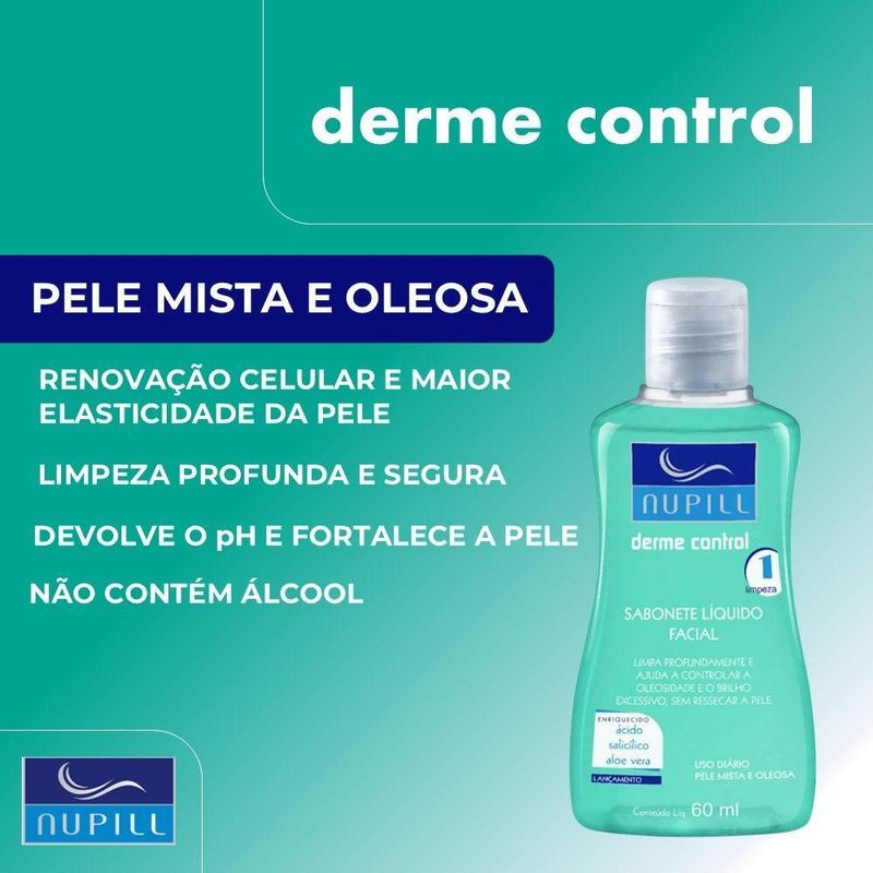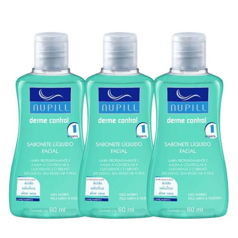 Kit 3 Sabonete Líquido Facial Antioliosidade Para Viagem Bolsa Dermecontrol 60mlKit 3 Sabonete Líquido Facial Antioliosidade para Viagem Bolsa DermeControl 60mlSabonete anti acne Nupill Derme ControlO Sabonete facial Nupill Derme Control limpa gentilmente a pele e remove com eficácia resíduos de maquiagem, excesso de oleosidade e impurezas que causam a acne. Foi desenvolvido para peles mistas e oleosas. Eficaz na prevenção e auxílio no tratamento da acne e controle de oleosidade excessiva. Sua pele mais saudável e livre de oleosidade e acne por mais tempo.Vantagens e benefícios· Enriquecido com ácido salicílico. Controla a oleosidade da pele.· Renova a pele e possui ação anti-inflamatória, bactericida e cicatrizante.· Formulado com aloe vera que ajuda a reter hidratação sem excesso de oleosidade.· Remove maquiagem com facilidade.ResultadoPele limpa, macia, sem brilho excessivo e com oleosidade controlada. usando diariamente você irá perceber diminuição da acne e melhora nos processos inflamatórios de cravos e espinhas.Sabonete Líquido Facial Antioliosidade para Viagem Bolsa DermeControl 60mlCódigo: 126821Referênica: 7898911309489Marca: NupillMaterial: LíquidoCor: IncolorDimensões do produto (AxLxC): 10,00x4,00x2,00cm cada unidadeQuantidade: Kit com 3 unidades