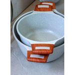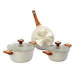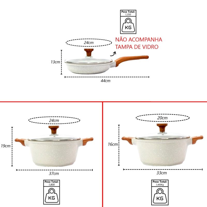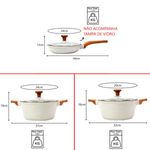 Kit 3pç Caçarolas Frigideiras Antiaderente Temperatti Bianco A panela antiaderente, também conhecida como teflon, é revestida com uma substância capaz de repelir certas substâncias. Por isso, a comida não gruda nela. É resistente a altas temperaturas e a arranhões. As caçarolas em alumínio antiaderente contam com uma camada que cobre o seu material e evita que o alimento grude em seu interior. Dessa forma, contribuem para uma culinária saudável, dispensando o uso excessivo de gordura ou óleos vegetais. Para quem gosta de um peixe ou filé de frango grelhado, ou não dispensa uma omelete delicioso, não pode deixar de ter uma em sua cozinha. Compatível com os demais fogões: Indução, Elétrico, Gás e Vitrocerâmico. Livre de PFOA. Manutenção e Dicas: 1. Evite grandes mudanças de temperatura. (Levar uma panela quente para a água fria pode fazer com que a panela deforme.) 2. Limpe suas panelas antiaderentes com esponjas que não causem riscos. 3. Use detergentes mais suaves para limpar suas panelas antiaderentes. 4. Não use metal na sua panela antiaderente. 5. Não é ideal para máquina lava louças. 6. Evite altas temperaturas de cozimento. 7. Não deixe a panela vazia no fogo. Especificações Técnicas:Alças e Cabos Revestidos com Soft Touch.Modelo: Temperatti.Fundo: 5mm.Linha: Bianco. Medidas Caçarola 20cm:Comprimento com a Alça: 33cm.Largura: 20cm.Peso: 1,400Kg.Altura: 16cm. Medidas Caçarola 24cm:Comprimento com a Alça: 37cm.Largura: 24cm.Peso: 1,800Kg.Altura: 19cm. Medidas Frigideira 24cm:Comprimento com o Cabo: 44cm.Largura: 24cm.Peso: 1,350Kg.Altura: 13cm. Itens Inclusos:01 Caçarola Antiaderente Cerâmico Temperatti Bianco AM TV 20cm.01 Caçarola Antiaderente Cerâmico Temperatti Bianco AM TV 24cm.01 Frigideira Antiaderente Cerâmico Temperatti Bianco CM 24cm.(Somente na frigideira que não acompanha a tampa) Código: 2149JAVProdutoLojaPlast.