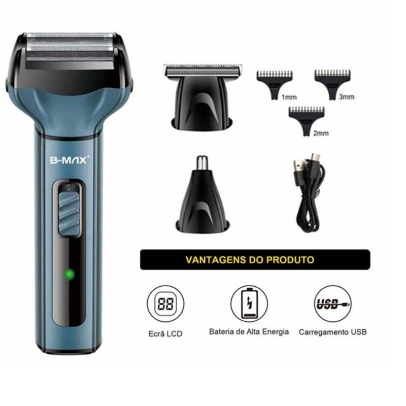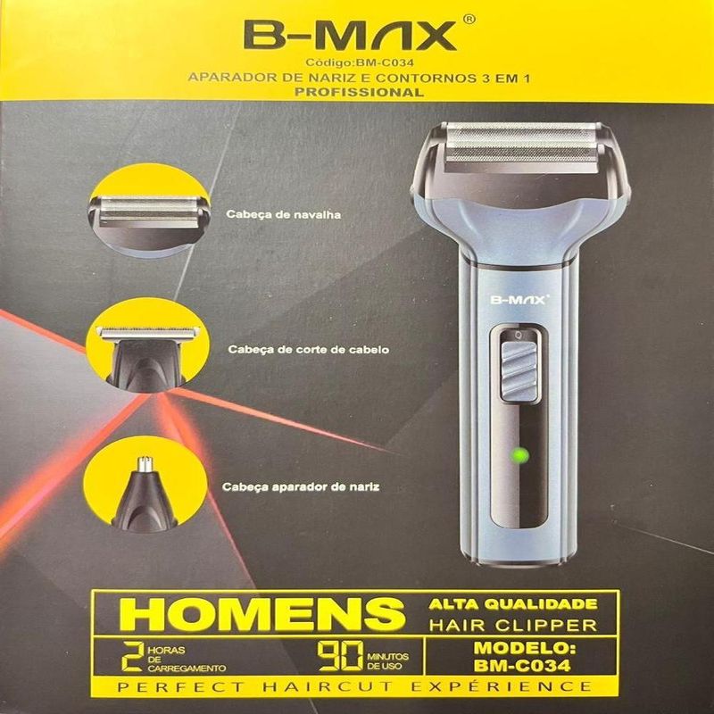 Máquina de Cortar Cabelo, Barbeador Elétrico, Aparador de Pêlos, Máquina de barbear, Recarregável 3 em 1- Modelo aerodinâmico e design ergonômico, este produto é uma máquina de cortar cabelo, barbeador e aparador de pelos recarregável.- O barbeador possui duas cabeças de corte flutuantes, com sistema de ação individual.-MODO DE USO.- A cabeça shaver é ideal para pessoas que tenham alergia a lâmina da Gillette ou a navalha, que é um método muito agressivo, com o shaver não vai causar essa irritação.- Lembrando que antes de usar o shaver é necessário passar uma máquina zero para cortar os pelos, depois vem o shaver. Ele não deve ser utilizado em pelos grandes.- Após raspar os pelos na zero, com a parte de cortar cabelo. Você usará o shaver a parte que tem duas lâminas para poder aparar os pelos e deixar liso como se fosse gillete.- Para efetuar a troca das cabeças do barbeador elétrico, basta girar a cabeça, no sentido ANTI-HORÁRIO, e para encaixa-lo novamente girando no sentido HORÁRIO.- Para recarregar deixe por 8 horas (Recomendado pelo fabricante).- Mantenha as lâminas sempre lubrificadas.- Alguma dúvida no uso do aparelho estou a disposição, utilize o campo de perguntas.Características:– Marca: B-Max– Modelo Número: BM-C039– Alimentação: Recarregável– Característica: Lâmina dupla– Utilização: Corpo, Barba, Bigode, Cabelo, nariz e orelhas.– Tempo de uso: Até 45 Minutos– Tempo de Carga: 8 horas– Tensão: 110-220v– Potencia nominal: 3W– Material: ABS + Stainless Steel– Tamanho: 16cm x 3cm– Tipo de Item: Barbeador Elétrico, Aparador de Pelos e Cortador de CabelosItens Inclusos:1 Máquina1 Cabo de carregamento1 Oléo lubrificante1 Pincel de limpeza1 Cabeça para barbear1 Cabeça aparador de pelos de Nariz1 Cabeça cortador de cabelo