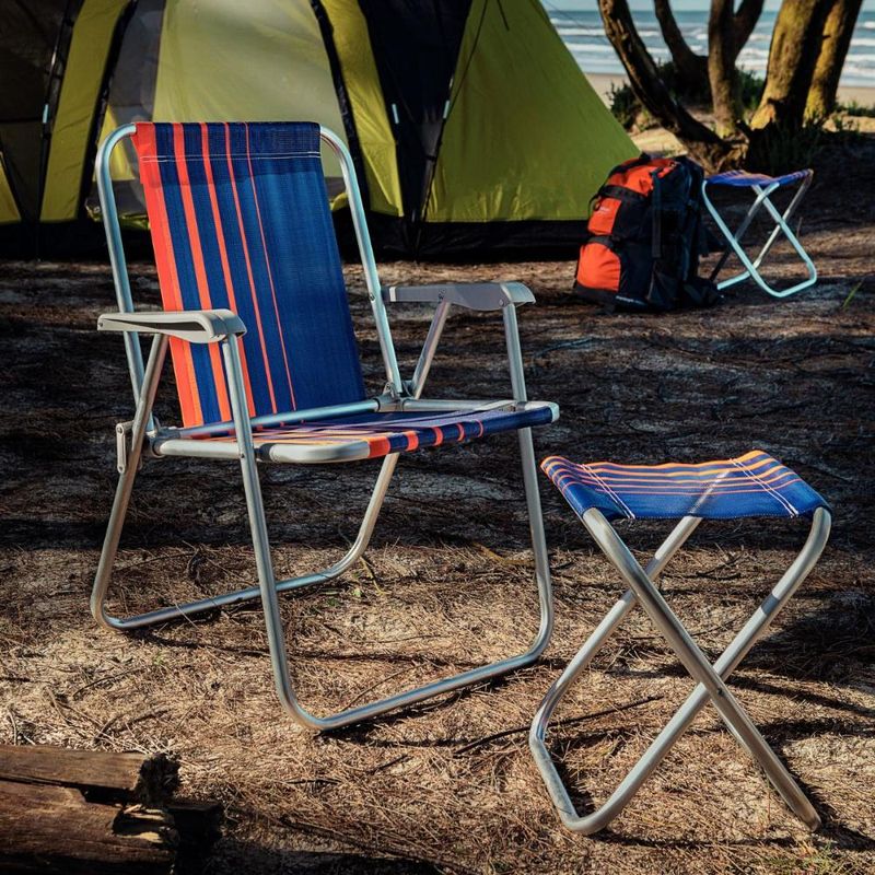 Kit 4 Cadeira de Praia Camping Alumínio Samoa Azul Marinho Tramontina A cadeira de praia Tramontina Samoa Alta em alumínio vai proporcionar aquele conforto gostoso à beira da praia, piscina ou num acampamento. Inspirada na ilha de Samoa, ela tem estampa moderna e exclusiva, concedendo aquele toque descontraído para seus momentos de lazer. Sua estrutura é altamente resistente e conta com tubo de alumínio e assento reforçado. Sua faixa e seus detalhes plásticos são na cor cinza, o que entrega um acabamento impecável e uniformidade visual! Descrição do produtoMarca: TramontinaLinha comercial: SamoaCor: Azul MarinhoQuantidade: 4 cadeirasPeso Máximo: 110 kgMaterial do Apoio: polipropileno injetadoMaterial da estrutura: tubo em alumínio naturalMaterial do assento: Polietileno com proteção ANTI-UVModelo: Dobrável Imagens meramente ilustrativas, todos os itens que ambientam o produto não estão inclusos.
