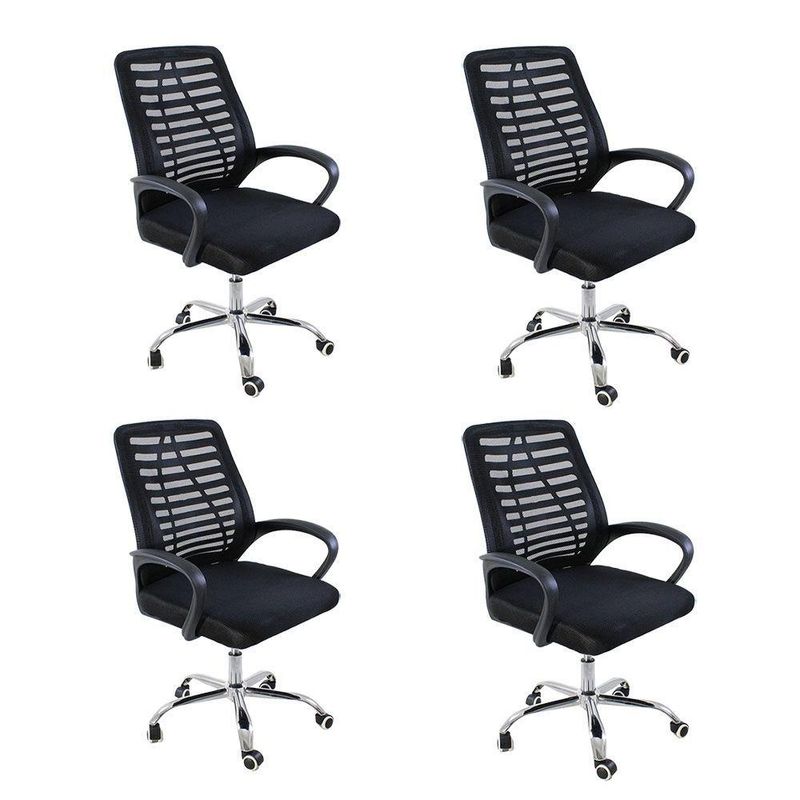 Kit 4 Cadeiras De Escritório Esteirinha Mesh Ergonômica Giratória PretoCadeira de Escritório Esteirinha Tela Mesh – Conforto, Leveza e Ergonomia para o Dia a DiaA Cadeira Esteirinha Tela Mesh foi desenvolvida para oferecer praticidade, ventilação e conforto para quem passa longas horas sentado. Com design leve, estrutura funcional e recursos essenciais de ergonomia, ela é ideal para escritórios, home office e ambientes de estudo que exigem mobilidade e bem-estar.Seu encosto em tela Mesh respirável garante excelente circulação de ar, reduzindo o acúmulo de calor durante o uso prolongado. O assento possui estrutura resistente em madeira multilaminada e revestimento confortável para tornar sua rotina mais agradável.Com ajuste de altura, sistema giratório e rodízios de movimentação suave, a Esteirinha oferece a versatilidade que o seu dia a dia precisa, ao mesmo tempo em que os apoios de braço fixos contribuem para uma postura mais estável e confortável.Disponível nas cores preta e branca, para combinar com diferentes estilos de ambiente.Conforto, Mobilidade e Ergonomia EssencialEncosto em tela Mesh respirável, proporcionando ventilação contínua.Assento com estrutura resistente e formato ergonômico para maior conforto ao longo do dia.Apoios de braço fixos que auxiliam na postura durante reuniões, atividades de escrita e uso de computador.Sistema giratório com rotação de 360º, oferecendo liberdade de movimento.Regulagem de altura que permite ajustar a postura ideal de acordo com sua mesa de trabalho.Rodízios resistentes e silenciosos, garantindo deslocamento suave no ambiente.Acompanha e-book exclusivo como material adicional.Medidas do ProdutoAlturaTotal: 89–97 cmAssento ao chão: 58–67 cmAltura do encosto: 51 cmAltura do braço: 23 cmLarguraBase 1 perna: 25 cmBase 2 pernas: 50 cmEncosto: 47 cmAssento: 46 cmDistância entre braços: 61 cmLargura do braço: 5 cmComprimentoEspessura do encosto: 2 cmAssento: 45,5 cmBraço: 32 cmInformações TécnicasPeso: 5 kgEstrutura: Nylon e aço cromadoRevestimento: Nylon e tela MeshBraços: PolipropilenoAssento: Madeira multilaminadaPeso máximo suportado: 120 kgCores disponíveis: Preto e BrancoLeveza, Funcionalidade e Conforto ao Seu AlcanceA Cadeira Esteirinha Tela Mesh é a escolha ideal para quem busca uma cadeira prática, arejada e confortável para uso diário.Combinando mobilidade, ergonomia e um design versátil, ela se adapta facilmente a diferentes ambientes — sempre entregando bem-estar e desempenho.