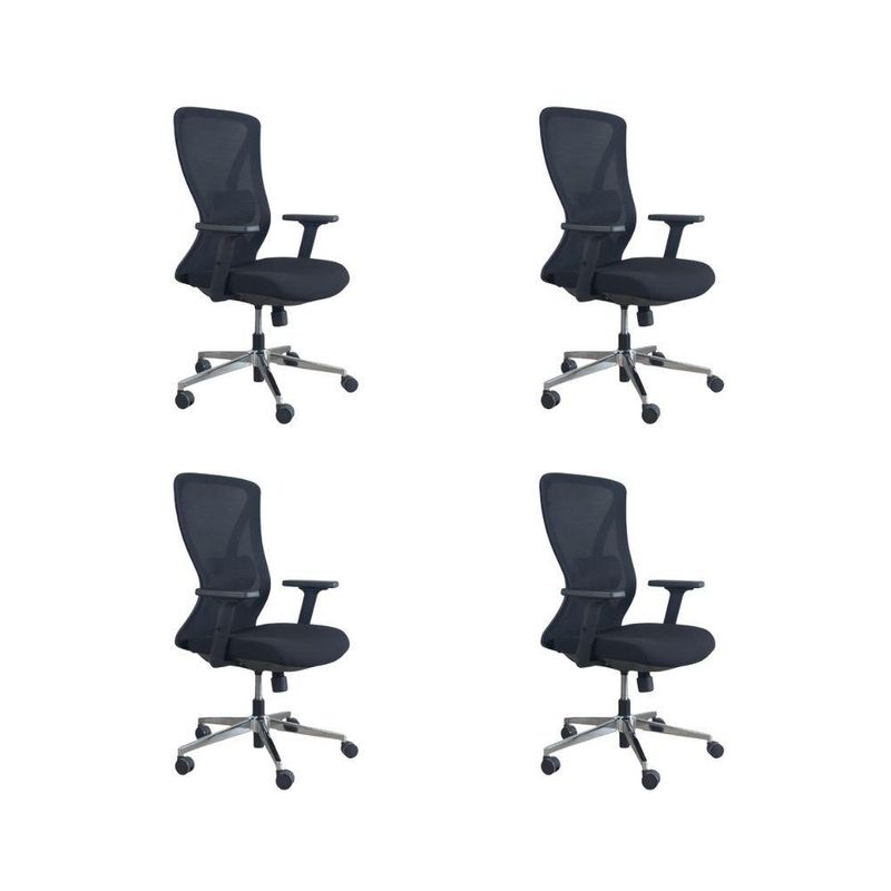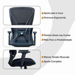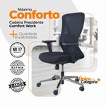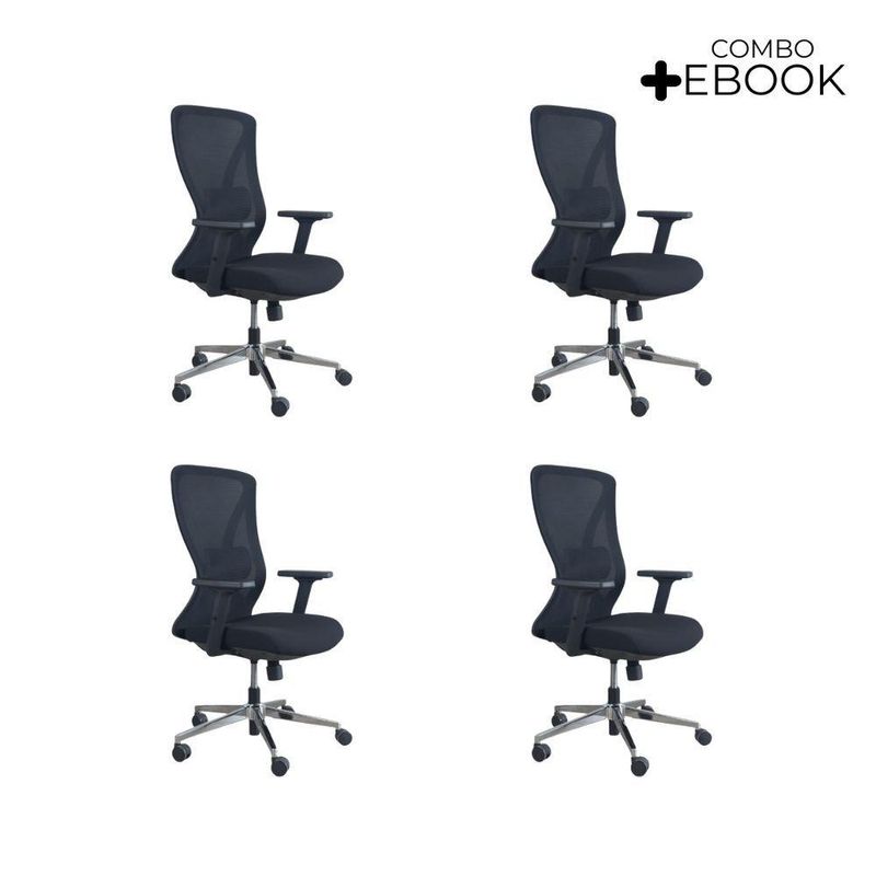 Kit 4 Cadeiras De Escritório Presidente Oficial Work Sem ApoioCadeira Diretor Oficial Comfort Work sem Apoio de cabeçaErgonomia profissional, ajustes inteligentes e estrutura premium.A Comfort Work foi desenvolvida para quem passa longas horas em frente ao computador e precisa de uma cadeira que ofereça conforto real, suporte completo e alta durabilidade. Com múltiplos ajustes, estrutura reforçada e design executivo, ela é perfeita para ambientes corporativos.A inclinação sincronizada é um mecanismo presente em cadeiras e poltronas que permite ao usuário ajustar o encosto e o assento de forma simultânea, proporcionando maior conforto e ergonomia durante o uso. Esse tipo de reclinação é comumente encontrado em móveis de escritório, especialmente em cadeiras de trabalho, onde a postura correta é essencial para evitar dores e lesões musculares.O encosto é revestido em tecido Mesh Premium, composto por 64% de poli elastômero e 36% de poliéster. Já o assento conta com espuma 35D, revestida em tecido 100% poliéster.Atende aos requisitos da NR-17 além disso possui o cobiçado selo BIFMA de qualidade, garantindo durabilidade e desempenho excepcionais.Garantia de 2 anos!Destaques do Produto:Encosto com armação traseira em PP com fibra de vidro, aprovado no teste de tração BIFMA (136 kg), com malha elástica respirável de alta qualidade. Apoio lombar 3D ajustável em altura e profundidade, oferecendo suporte personalizado à região lombar. Braços com regulagem 2D (altura), promovendo conforto e postura adequada. Assento com espuma moldada de densidade média e alta resiliência, oferecendo equilíbrio entre maciez e sustentação. Base com trava de posição e mecanismo de balanço livre, para mais liberdade de movimento. Pistão a gás de 3 estágios, curso de 100 mm, em acabamento preto. Estrutura da base em tubos quadrados eletroplated Ø 350 mm, resistente e elegante. Rodízios em PU Ø 60 mm, silenciosos e ideais para diferentes tipos de piso. Dimensões Aproximadas:Altura total: 104 a 113 cm Altura do assento ao chão: 41 a 51 cm Largura entre braços: 66 cm Altura dos braços: 18 a 27 cm Largura do assento: 52 cm Profundidade do assento: 51 cm Distância entre os pés: 67 cm Extras: acompanha e-book exclusivo. Com estrutura profissional, materiais de alta performance e ajustes ergonômicos, a Comfort Work oferece mais conforto, produtividade e qualidade de vida no seu dia a dia.Seu trabalho merece mais conforto. Escolha a Comfort Work.