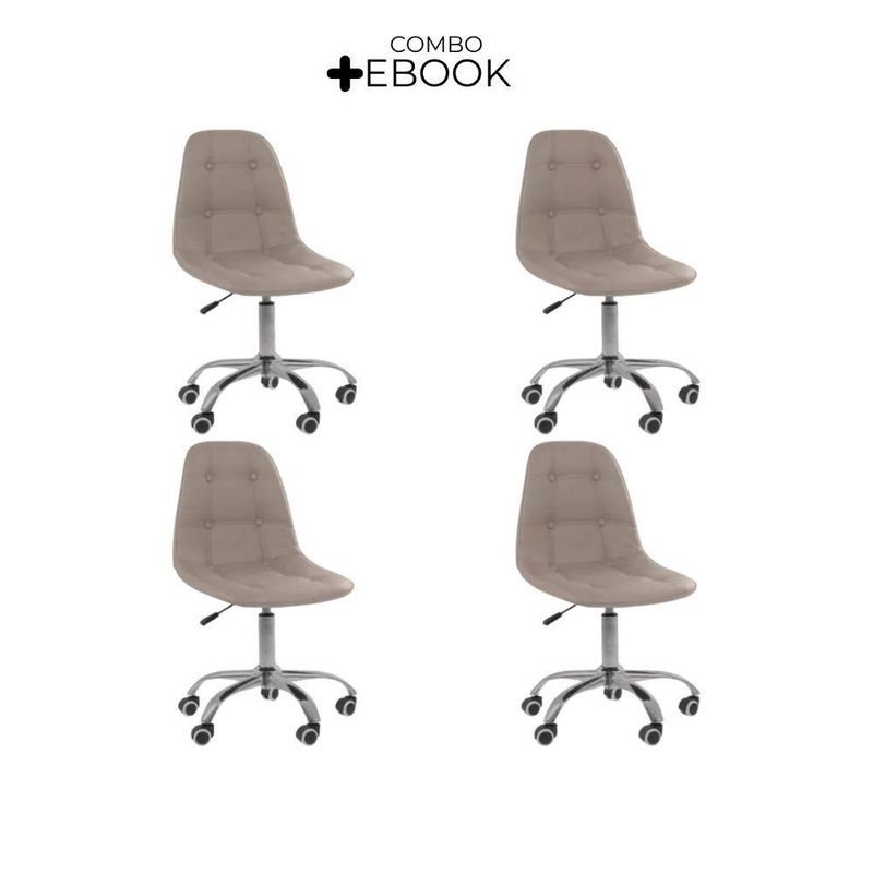Kit 4 Cadeiras Office Eiffel Botonê Oficial BegeCadeira Office Eiffel Botonê Ajustável com Base Giratória – Design, Conforto e Versatilidade para o Seu EspaçoDescubra o equilíbrio ideal entre estilo moderno e conforto ergonômico com a Cadeira Office Eiffel Botonê Ajustável com Base Giratória.Desenvolvida para oferecer elegância e funcionalidade, ela é perfeita para escritórios, home offices, salas de estudo, áreas de lazer e ambientes comerciais.Seu design contemporâneo com estofamento botonê traz um toque sofisticado à decoração, enquanto o assento anatômico e o encosto ergonômico garantem conforto e postura correta mesmo durante longos períodos de uso.Com ajuste de altura e base giratória com rodízios, a Cadeira Eiffel Botonê proporciona mobilidade suave e personalização de uso, adaptando-se facilmente às suas necessidades diárias com praticidade e estilo.A montagem é simples e rápida — acompanha manual de instruções e suporte de atendimento especializado para qualquer dúvida. Diferenciais do ProdutoDesign Sofisticado e Ergonômico: Estilo botonê moderno com curvas anatômicas que garantem conforto e elegância.Ajuste de Altura Personalizado: Permite adaptar a cadeira ao seu biotipo e à altura da mesa.Base Giratória com Rodízios Cromados: Mobilidade fluida e estabilidade em qualquer superfície.Estrutura Resistente e Durável: Produzida em polipropileno (PP) e aço cromado de alta qualidade.Revestimento Premium: Material sintético (PU) de toque suave e fácil limpeza.Versatilidade de Uso: Ideal para ambientes corporativos e residenciais.Montagem Simples: Acompanha manual e suporte pós-venda especializado.Extras: acompanha e-book exclusivo. Especificações TécnicasModelo: Eiffel BotonêMarca: Oficial WebshopTipo de Cadeira: Office / GiratóriaMaterial da Estrutura: Polipropileno (PP) e Aço CromadoRevestimento: Material Sintético (PU)Assento e Encosto: Madeira multilaminada com acabamento botonêBase: Giratória com rodízios e regulagem de alturaPeso Máximo Suportado: 120 kgPeso da Cadeira: 5,5 kg Dimensões do ProdutoAltura Total (mín./máx.): 84,5 cm a 98 cmAltura do Assento (mín./máx.): 44,5 cm a 58 cmAltura do Encosto: 68 cmLargura do Assento: 43 cmProfundidade do Assento: 41 cmLargura da Base (pernas): 47,5 cmEspessura do Encosto: 5 cm Cuidados e ManutençãoLimpe com pano úmido e detergente neutro, evitando produtos abrasivos que possam danificar o acabamento.Evite exposição direta ao sol para preservar a cor, o brilho e a durabilidade do revestimento e da base cromada. Conforto e Estilo em Cada Detalhe!A Cadeira Office Eiffel Botonê Ajustável com Base Giratória combina ergonomia, resistência e elegância em um único design.Ideal para quem busca um ambiente funcional e sofisticado, ela transforma o seu espaço em um local mais confortável, moderno e inspirador.