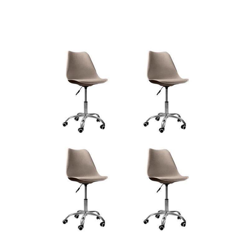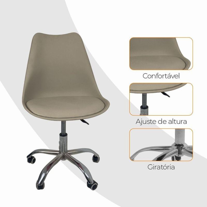 Kit 4 Cadeiras Office Oficial Bas Cromada Giratória Saarinen BegeCadeira Office Saarinen Base Cromada com Rodízios – Conforto, Design Moderno e VersatilidadeA Cadeira Office Saarinen Base Cromada com Rodízio Giratório é ideal para quem busca um móvel que una estilo, conforto e funcionalidade. Seu design contemporâneo se adapta perfeitamente a diversos ambientes, como escritório, home office, sala de jantar ou quarto, garantindo elegância e praticidade no dia a dia.Medidas do Produto:Altura Total: 83 a 96 cmAltura do Assento ao Chão: 47 a 60 cmAltura do Encosto: 48 cmLargura:- Pernas: 30 cm- Assento: 48 cm- Encosto: 48 cmComprimento:- Encosto: 2 cm- Assento: 41 cmPeso: 6 kgPeso Máximo Suportado: 120 kgMateriais- Revestimento em couro sintético (PU), resistente e fácil de limpar- Assento em madeira multilaminada, oferecendo firmeza e durabilidade- Base cromada com rodízios, garantindo mobilidade e estabilidadeDiferencialAcompanha E-book exclusivo!