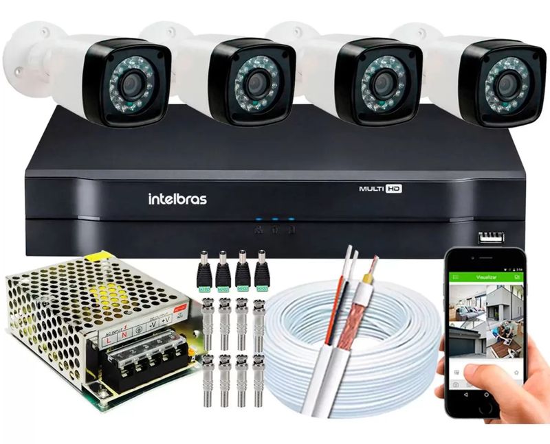 Kit 4 Cameras Segurança Hd Dvr Intelbras mhdx 4ch S/hd ACESSO VIA SMARTPHONE E COMPUTADOR CONTEÚDO 01 DVR INTELBRAS MHDX 5X1 DE 04 CANAIS 04 CÂMERAS IMPORT HD 720P 1MP 20M COM INFRAVERMELHO 01 FONTE ELETRÔNICA CHAVEADA 12V 05A BIVOLT 01 CAIXA COM 100 METROS DE CABO COAXIAL FLEXÍVEL 4MM 80% DE MALHA 08 CONECTORES BNC ANTIRRUÍDO PARAFUSO E MOLA 04 CONECTORES P4 MACHO COM BORNE 01 MOUSE USB * ESSE KIT NÃO ACOMPANHA HD INTERNO SATA CARACTERÍSTICAS DVR DE 04 CANAIS INTELBRAS MHDX - MODELO: MHDX. - TECNOLOGIAS: 5X1 (HDCVI + HDTVI + AHD + analógica + IP). - QUANTIDADE DE CANAIS: 4 canais BNC + 1 canais IP ou 5 canais IP no modo NVR. - RESOLUÇÃO DE GRAVAÇÃO / VISUALIZAÇÃO: 1080p, 1080p Lite ou 720p. - CONEXÃO DE REDE: Cabo RJ45 (10/100 M). - SAÍDAS DE VÍDEO: VGA, HDMI e BNC. - INTELIGÊNCIA DE VÍDEO: Edição de áudio e vídeo / Detecção de movimento. - MODO DE GRAVAÇÃO: Suporta 1 HD SATA interno de até 12 TB. - ACESSO REMOTO: Nuvem e DDNS sem custo. - APLICATIVO DE ACESSO REMOTO: ISIC Lite. CÂMERA HD BULLET - TECNOLOGIA: 4X1 - HDCVI, AHD-M, HDTVI e Analógico. - RESOLUÇÃO DE GRAVAÇÃO / VISUALIZAÇÃO: Full HD - 720p (1MP). - FORMATO: Bullet. - LENTE: 2.8 mm. - SENSOR: 1/2.9' 1 megapixels CMOS. - ÂNGULO DE VISÃO HORIZONTAL: 96°. - CONECTORES: BNC Fêmea e P4 Fêmea. - CASE: Plástico. - INFRAVERMELHO: Sim - 20 metros. - PROTEÇÃO: IP66 (proteção contra poeira e chuva) e antivandalismo. - LOCAL DE INSTALAÇÃO: Interno / Externo.