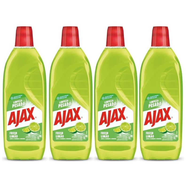 Kit com 4 Limpador Diluível Ajax Fresh Limão Limpeza Pesada 1 Litro cadaEficiência e Perfume de Longa Duração (até 12 horas). Instruções de uso: Dilua 2 tampas e meia do produto em 5 litros de água, umedeça o pano e passe sobre as superfícies. Rende 60 LitrosCombina a eficiência da limpeza com fragrâncias especiais de flores e perfume de longa duraçãoÉ indicado para pisos, azulejos, vidros, cerâmicas e superfícies laváveis, com delicioso perfume que dura até 24hContém 1 litro (rende até 60 litros)Combinação de limpeza e aroma deliciosoEficácia garantidaLimpeza fácil:Dilua 2 tampas e meia do produto (80 ml) em 5 litros de água. Umedeça o pano e passe sobre as superfícies a serem limpas.Limpeza pesadaSe a limpeza é mais difícil, pode utilizar o produto puro com um pano úmido para remoção das manchas e sujeiras mais difíceis.Garantia 3 Meses