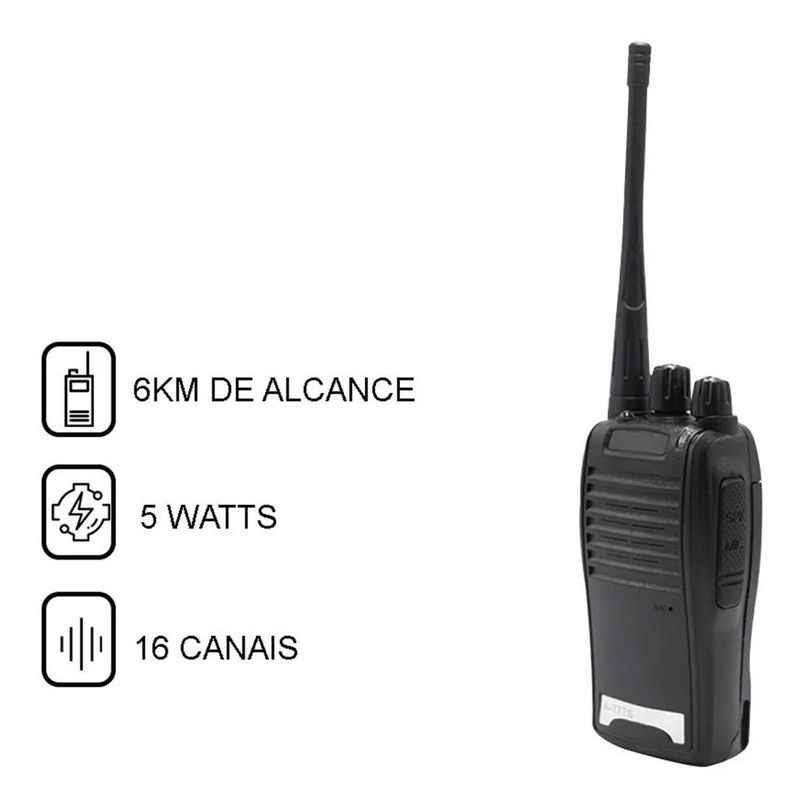 - O Rádio Comunicador Uhf/Vhf Walkie Talkie BF-777S é essencial para qualquer sistema de proteção e segurança. Este rádio possui capacidade para 16 canais, para que possa se comunicar com rapidez, segurança e sem custos adicionais - Não perde frequência de comunicação e trás o melhor de um dispositivo que faz parte da segurança de um local. Informações Gerais - 16 Canais - Faixa de comunicação Longa - Carregador 110v/220v (Bivolt) - Entradas MIC e SP - 400 ~ 470mHz INFORMAÇÕES TÉCNICAS - Equipamentos de voz seguro - Frequência: 400-470MHz - Capacidade: 1500mAh - Espaçamento entre canais - Power: 5W - Tensão Operado - 3,7 V - Bateria - Voltagem: 7,4V Itens Inclusos: 04 Rádios Comunicadores Walk Talk Baofeng BF-777s 04 Baterias 04 Fontes Carregador 04 Antenas 04 Alças de Pulsos 04 Clipes de cinto 04 Fones de ouvido