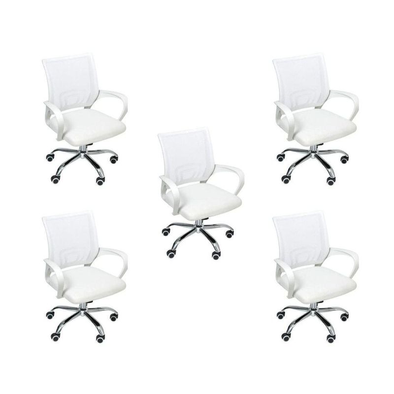 Kit 5 Cadeiras De Escritório Begonia Tela Mesh Ergonômica BrancoA escolha de uma cadeira adequada é muito importante para evitar futuras lesões. Com esta cadeira da Begônia você terá o conforto é o bem-estar que precisa ao longo do seu dia. Além disso, você pode colocá-la em qualquer lugar da sua casa ou oficina, pois o seu design se adapta a vários ambientes. Dê um toque mais moderno aos seus espaços!Ajuste-a a sua medidaCom seu ajuste de altura, você poderá fixar a posição de seu torso em relação à mesa de trabalho e assim obterá uma cadeira mais confortável ao nível de suas necessidades.Cuide do seu corpoOs apoios de braços vão favorecer a sua postura ao escrever e o ajudarão a se incorporar com mais facilidade quando quiser.Mantenha-se em movimentoAs rodas permitirão a você mover e limpar facilmente o seu espaço. Você será capaz de movê-la sem dificuldade quando precisar.Além disso, sendo giratória, permitirá que você gire o assento 360º sem a necessidade de mudar de posição ou se mover de onde você está.AlturaTotal: 100-90 cmBraço até o chão: 75-63 cmAssento até o chão: 58-46 cmEncosto: 48 cmBraço: 28 cmLargura1 Perna: 25 cm2 Pernas: 50 cmAssento: 45 cmEncosto: 40,5 cmBraço: 4,5 cmDe um braço ao outro: 54 cmComprimentoEncosto: 2 cmAssento: 47,5 cmBraço: 30 cmPeso: 5,5 kgEstrutura: Nylon e aço cromadoRevestimento: Nylon, Tela MeshBraço: PolipropilenoAssento: Madeira multi laminadaPeso máximo recomendado: 110 Kg
