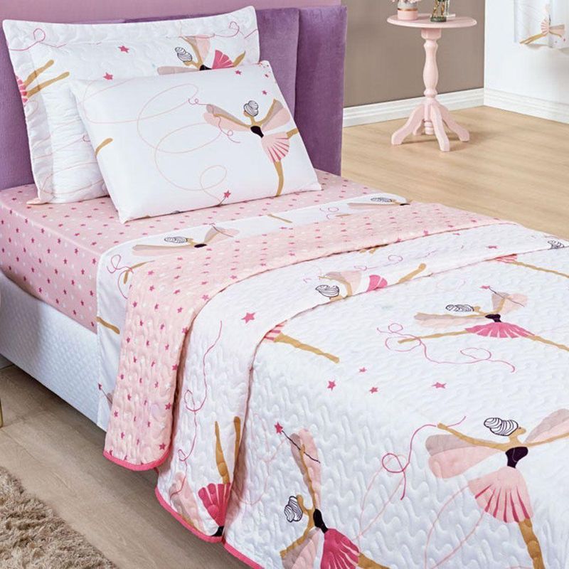 Kit 5 Peças Fantasy = Colcha Solteiro Infantil + Jogo De Lençol - Bailarina Branco RosaOpção perfeita para quem gosta de mudar o visual do quarto. O Kit Fantasy é fabricado com estampas temáticas e divertidas que vão complementar a decoração do quarto do seu pequeno.Contém na embalagem:01 Colcha 2,40m comprimento x 1,60m largura01 Porta Travesseiro 70cm x 55cm 01 Lençol de cima 2,50m X 1,50m 01 Lençol de Baixo com Elástico 90cm X 1,90m X 30cm 01 Fronha 70cm X 50cmComposição da Colcha:Tecido Microfibra: 100% PoliésterEnchimento: 100% PoliésterComposição do Jogo de Lençol:Tecido Microfibra: 100% PoliésterAs fotos são meramente ilustrativas. As cores podem variar de acordo com cada monitor e não representam todas as peças que compõem a descrição do produto.Fique atento à descrição do produto.