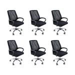 Kit 6 Cadeiras De Escritório Esteirinha Mesh Ergonômica Giratória PretoCadeira de Escritório Esteirinha Tela Mesh – Conforto, Leveza e Ergonomia para o Dia a DiaA Cadeira Esteirinha Tela Mesh foi desenvolvida para oferecer praticidade, ventilação e conforto para quem passa longas horas sentado. Com design leve, estrutura funcional e recursos essenciais de ergonomia, ela é ideal para escritórios, home office e ambientes de estudo que exigem mobilidade e bem-estar.Seu encosto em tela Mesh respirável garante excelente circulação de ar, reduzindo o acúmulo de calor durante o uso prolongado. O assento possui estrutura resistente em madeira multilaminada e revestimento confortável para tornar sua rotina mais agradável.Com ajuste de altura, sistema giratório e rodízios de movimentação suave, a Esteirinha oferece a versatilidade que o seu dia a dia precisa, ao mesmo tempo em que os apoios de braço fixos contribuem para uma postura mais estável e confortável.Disponível nas cores preta e branca, para combinar com diferentes estilos de ambiente.Conforto, Mobilidade e Ergonomia EssencialEncosto em tela Mesh respirável, proporcionando ventilação contínua.Assento com estrutura resistente e formato ergonômico para maior conforto ao longo do dia.Apoios de braço fixos que auxiliam na postura durante reuniões, atividades de escrita e uso de computador.Sistema giratório com rotação de 360º, oferecendo liberdade de movimento.Regulagem de altura que permite ajustar a postura ideal de acordo com sua mesa de trabalho.Rodízios resistentes e silenciosos, garantindo deslocamento suave no ambiente.Acompanha e-book exclusivo como material adicional.Medidas do ProdutoAlturaTotal: 89–97 cmAssento ao chão: 58–67 cmAltura do encosto: 51 cmAltura do braço: 23 cmLarguraBase 1 perna: 25 cmBase 2 pernas: 50 cmEncosto: 47 cmAssento: 46 cmDistância entre braços: 61 cmLargura do braço: 5 cmComprimentoEspessura do encosto: 2 cmAssento: 45,5 cmBraço: 32 cmInformações TécnicasPeso: 5 kgEstrutura: Nylon e aço cromadoRevestimento: Nylon e tela MeshBraços: PolipropilenoAssento: Madeira multilaminadaPeso máximo suportado: 120 kgCores disponíveis: Preto e BrancoLeveza, Funcionalidade e Conforto ao Seu AlcanceA Cadeira Esteirinha Tela Mesh é a escolha ideal para quem busca uma cadeira prática, arejada e confortável para uso diário.Combinando mobilidade, ergonomia e um design versátil, ela se adapta facilmente a diferentes ambientes — sempre entregando bem-estar e desempenho.