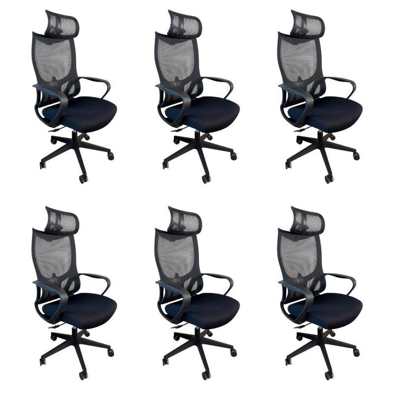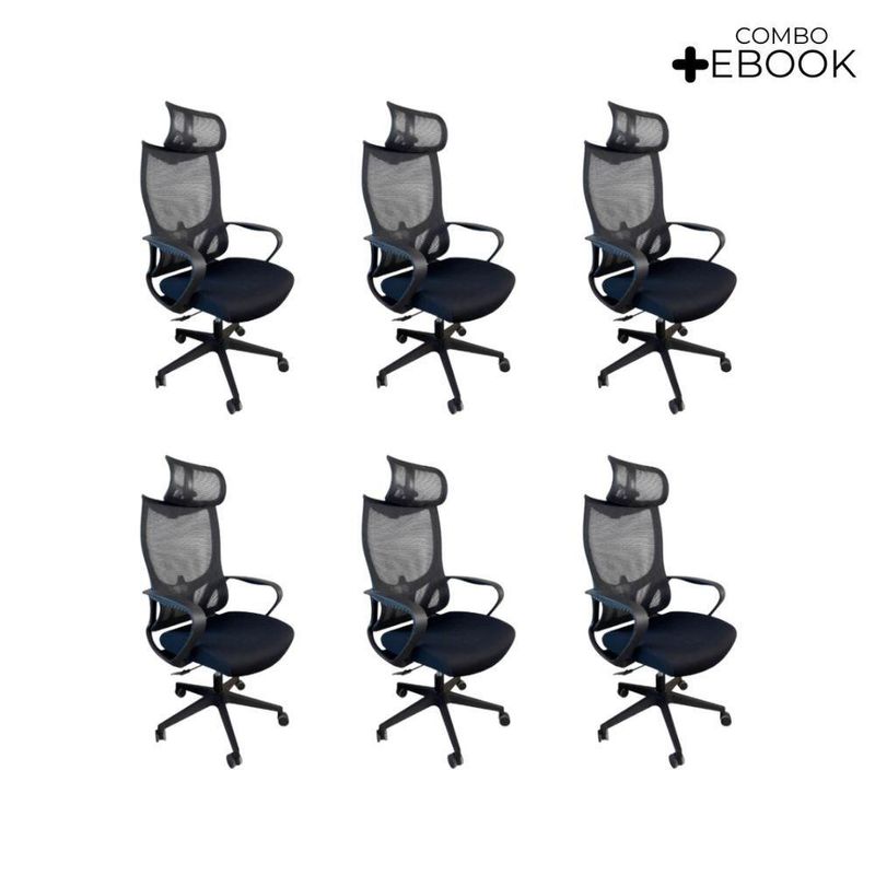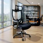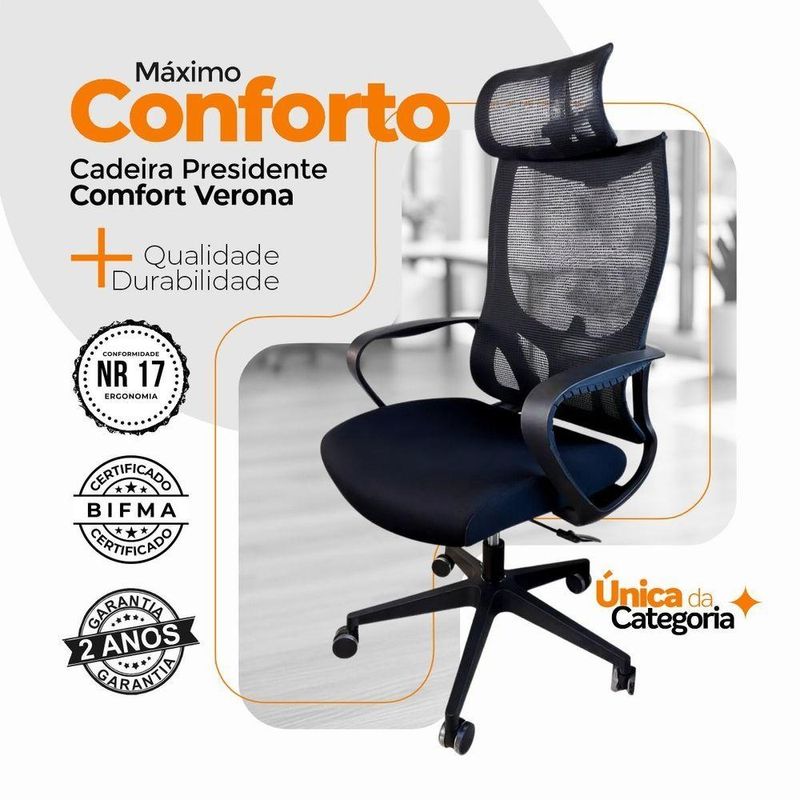 Kit 6 Cadeiras De Escritório Oficial Verona ApoioCadeira Presidente Oficial Comfort Verona com Apoio de NucaDesign ergonômico, conforto inteligente e estilo profissional.Projetada para quem exige conforto e postura durante longas horas de trabalho, a Cadeira Comfort Verona entrega ergonomia de ponta, materiais de qualidade e visual moderno.O encosto é revestido em tecido Mesh Premium, composto por 64% de poli elastômero e 36% de poliéster. Já o assento conta com espuma 35D, revestida em tecido 100% poliéster.Atende aos requisitos da NR-17. Além disso, possui o cobiçado selo BIFMA de qualidade, garantindo durabilidade e desempenho excepcionais!Garantia de 2 anos!Diferenciais do Produto:Encosto com curvatura em “S” – Segue a anatomia da coluna, oferecendo suporte lombar natural.Apoio de cabeça multi-regulável – Ajuste de altura e ângulo para aliviar tensões cervicais.Apoio de braços fixos – Em PP virgem com fibra de vidro, alta resistência e acabamento sofisticado.Assento anatômico – Espuma moldada de alta resiliênciaMecanismo butterfly – Curso médio de 25 mm, flexível e confiável.Pistão a gás preto #85 – Curso de 40 mm para ajuste de altura suave.Base em nylon Ø 320 mm – Leve, resistente com fibra de vidro.Rodízios de nylon Ø 55 mm – Movimentação fluida e silenciosa.Extras: acompanha e-book exclusivo.Dimensões Aproximadas:Altura total: 100 a 110 cmAltura do assento até o chão: 34 a 50 cmLargura entre braços: 59 cmLargura do assento: 49 cmProfundidade do assento: 51 cmAltura dos braços: 28 cmDistância entre os pés: 67 cmAltura do encosto: 18 cmLargura do encosto: 35 cmIdeal para home office, escritórios executivos ou salas de reunião, a Comfort Verona une ergonomia, leveza e elegância em uma só cadeira.Conforto e produtividade ao seu alcance com a Comfort Verona.