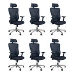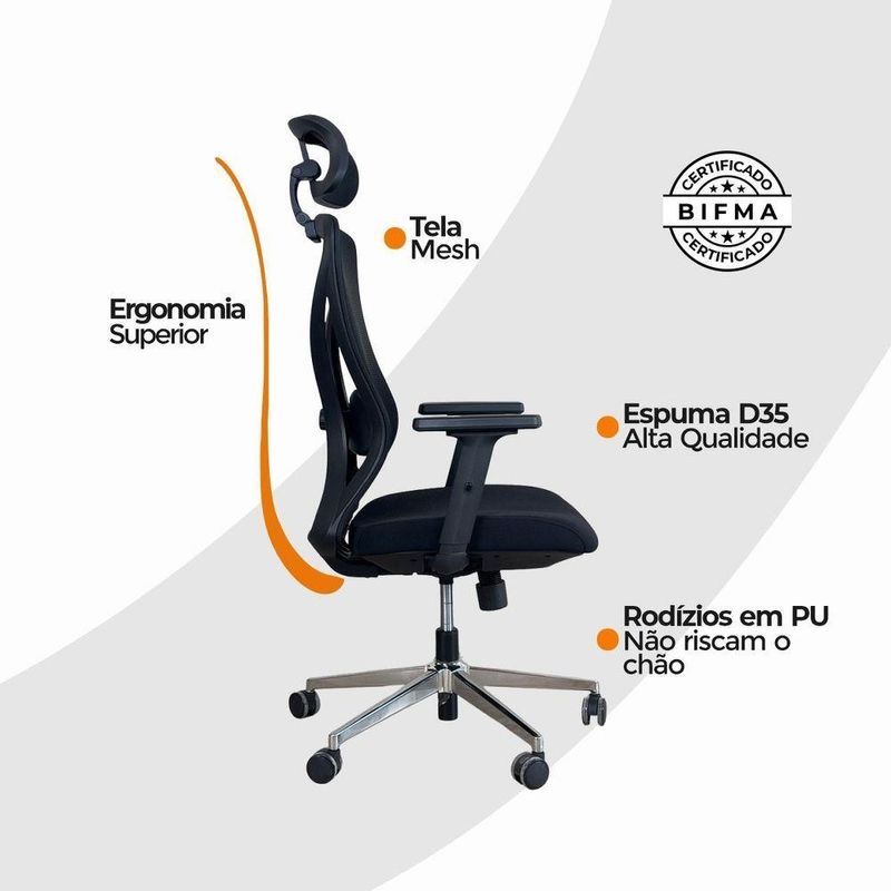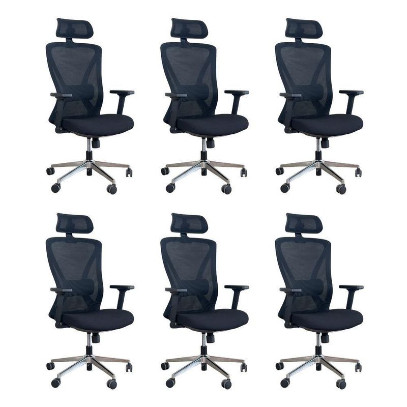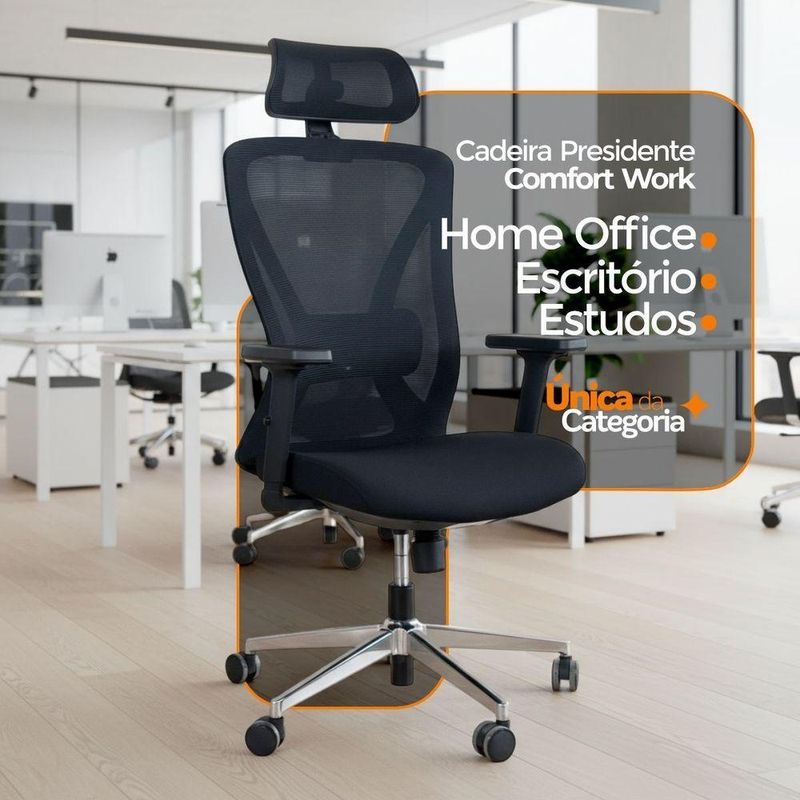 Kit 6 Cadeiras De Escritório Presidente Oficial WorkCadeira Presidente Oficial Comfort Work com Apoio de cabeçaErgonomia profissional, ajustes inteligentes e estrutura premium.A Comfort Work foi desenvolvida para quem passa longas horas em frente ao computador e precisa de uma cadeira que ofereça conforto real, suporte completo e alta durabilidade. Com múltiplos ajustes, estrutura reforçada e design executivo, ela é perfeita para ambientes corporativos.A inclinação sincronizada é um mecanismo presente em cadeiras e poltronas que permite ao usuário ajustar o encosto e o assento de forma simultânea, proporcionando maior conforto e ergonomia durante o uso. Esse tipo de reclinação é comumente encontrado em móveis de escritório, especialmente em cadeiras de trabalho, onde a postura correta é essencial para evitar dores e lesões musculares.O encosto é revestido em tecido Mesh Premium, composto por 64% de poli elastômero e 36% de poliéster. Já o assento conta com espuma 35D, revestida em tecido 100% poliéster.Atende aos requisitos da NR-17 além disso possui o cobiçado selo BIFMA de qualidade, garantindo durabilidade e desempenho excepcionais.Garantia de 2 anos!Destaques do Produto:Apoio de cabeça 3D, funcional, moldado em peça única de PP com fibra, ajustável em inclinação e altura.Encosto com armação traseira em PP com fibra de vidro, aprovado no teste de tração BIFMA (136 kg), com malha elástica respirável de alta qualidade.Apoio lombar 3D ajustável em altura e profundidade, oferecendo suporte personalizado à região lombar.Braços com regulagem 2D (altura), promovendo conforto e postura adequada.Assento com espuma moldada de densidade média e alta resiliência, oferecendo equilíbrio entre maciez e sustentação.Base com trava de posição e mecanismo de balanço livre, para mais liberdade de movimento.Pistão a gás de 3 estágios, curso de 100 mm, em acabamento preto.Estrutura da base em tubos quadrados eletroplated Ø 350 mm, resistente e elegante.Rodízios em PU Ø 60 mm, silenciosos e ideais para diferentes tipos de piso.Extras: acompanha e-book exclusivo.Dimensões Aproximadas:Altura total: 104 a 113 cmAltura do assento ao chão: 41 a 51 cmLargura entre braços: 66 cmAltura dos braços: 18 a 27 cmLargura do assento: 52 cmProfundidade do assento: 51 cmDistância entre os pés: 67 cmLargura do encosto (com apoio): 33 cmAltura do encosto (com apoio): 17 cmCom estrutura profissional, materiais de alta performance e ajustes ergonômicos, a Comfort Work oferece mais conforto, produtividade e qualidade de vida no seu dia a dia.Seu trabalho merece mais conforto. Escolha a Comfort Work.
