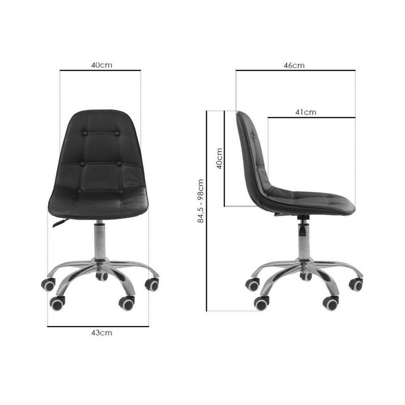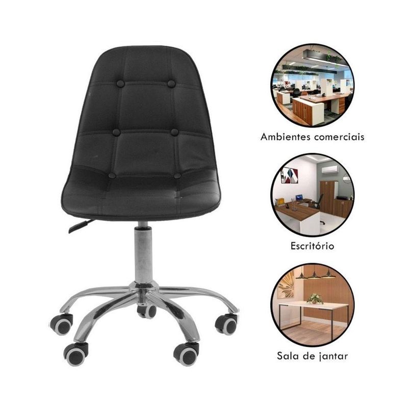 Kit 6 Cadeiras Office Eiffel Botonê Ajustável Base Giratória PretaPara quem busca dar vida e sofisticação ao ambiente e conforto a Cadeira Office Eiffel Botonê é uma ótima opção. Ela se adapta a qualquer ambiente e é forte tendência em decoração. Projetadas para combinar com qualquer ambiente que você desejar usá-las: para sala de jantar, cozinha, no quarto ou escritório, áreas de lazer, e ambientes comerciais. A escolha de uma cadeira adequada é muito importante para evitar futuras lesões. Com esta cadeira você terá o conforto é o bem-estar que precisa ao longo do seu dia. Além disso, você pode colocá-la em qualquer lugar da sua casa ou oficina, pois o seu design se adapta a vários ambientes. Dê um toque mais moderno aos seus espaços! Conforto em todos os momentos O seu encosto reclinável lhe permitirá regular os diferentes pontos de inclinação, bem como deixá-la em posição livre para balançar durante as pausas e descansos. Ajuste-a a sua medida Com seu ajuste de altura, você poderá fixar a posição de seu torso em relação à mesa de trabalho e assim obterá uma cadeira mais confortável ao nível de suas necessidades. Mantenha-se em movimento As rodas permitirão a você mover e limpar facilmente o seu espaço. Você será capaz de movê-la sem dificuldade quando ém disso, sendo giratória, permitirá que você gire o assento 360º sem a necessidade de mudar de posição ou se mover de onde você está.
