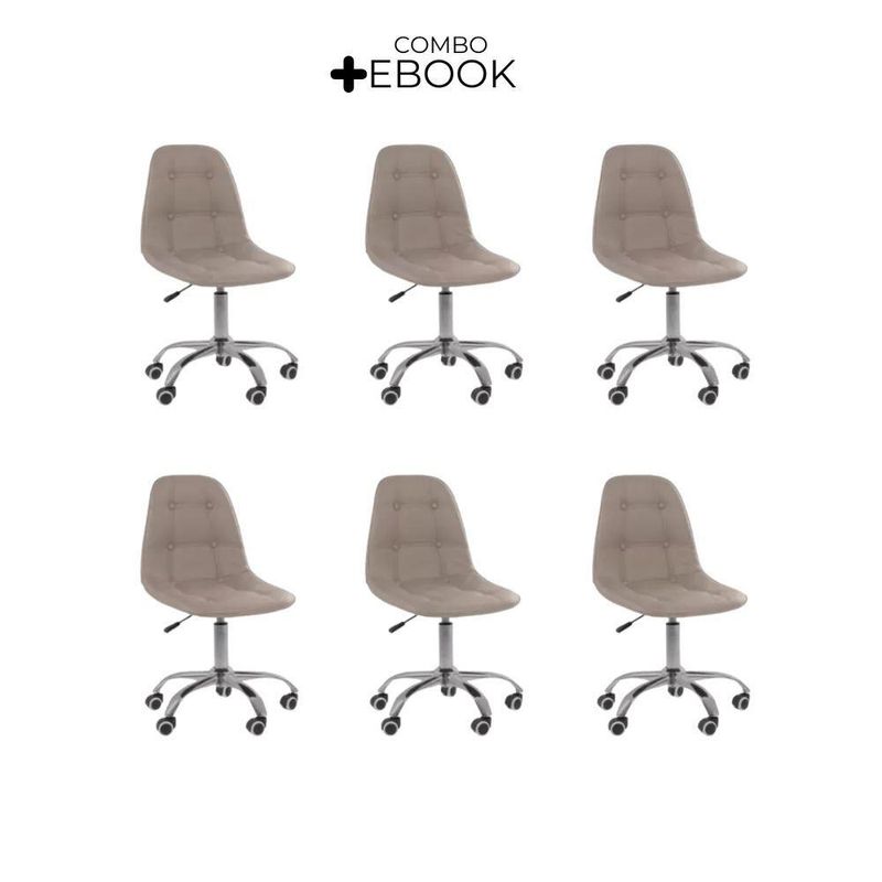 Kit 6 Cadeiras Office Eiffel Botonê Oficial Base BegeCadeira Office Eiffel Botonê Ajustável com Base Giratória – Design, Conforto e Versatilidade para o Seu EspaçoDescubra o equilíbrio ideal entre estilo moderno e conforto ergonômico com a Cadeira Office Eiffel Botonê Ajustável com Base Giratória.Desenvolvida para oferecer elegância e funcionalidade, ela é perfeita para escritórios, home offices, salas de estudo, áreas de lazer e ambientes comerciais.Seu design contemporâneo com estofamento botonê traz um toque sofisticado à decoração, enquanto o assento anatômico e o encosto ergonômico garantem conforto e postura correta mesmo durante longos períodos de uso.Com ajuste de altura e base giratória com rodízios, a Cadeira Eiffel Botonê proporciona mobilidade suave e personalização de uso, adaptando-se facilmente às suas necessidades diárias com praticidade e estilo.A montagem é simples e rápida — acompanha manual de instruções e suporte de atendimento especializado para qualquer dúvida. Diferenciais do ProdutoDesign Sofisticado e Ergonômico: Estilo botonê moderno com curvas anatômicas que garantem conforto e elegância.Ajuste de Altura Personalizado: Permite adaptar a cadeira ao seu biotipo e à altura da mesa.Base Giratória com Rodízios Cromados: Mobilidade fluida e estabilidade em qualquer superfície.Estrutura Resistente e Durável: Produzida em polipropileno (PP) e aço cromado de alta qualidade.Revestimento Premium: Material sintético (PU) de toque suave e fácil limpeza.Versatilidade de Uso: Ideal para ambientes corporativos e residenciais.Montagem Simples: Acompanha manual e suporte pós-venda especializado.Extras: acompanha e-book exclusivo. Especificações TécnicasModelo: Eiffel BotonêMarca: Oficial WebshopTipo de Cadeira: Office / GiratóriaMaterial da Estrutura: Polipropileno (PP) e Aço CromadoRevestimento: Material Sintético (PU)Assento e Encosto: Madeira multilaminada com acabamento botonêBase: Giratória com rodízios e regulagem de alturaPeso Máximo Suportado: 120 kgPeso da Cadeira: 5,5 kg Dimensões do ProdutoAltura Total (mín./máx.): 84,5 cm a 98 cmAltura do Assento (mín./máx.): 44,5 cm a 58 cmAltura do Encosto: 68 cmLargura do Assento: 43 cmProfundidade do Assento: 41 cmLargura da Base (pernas): 47,5 cmEspessura do Encosto: 5 cm Cuidados e ManutençãoLimpe com pano úmido e detergente neutro, evitando produtos abrasivos que possam danificar o acabamento.Evite exposição direta ao sol para preservar a cor, o brilho e a durabilidade do revestimento e da base cromada. Conforto e Estilo em Cada Detalhe!A Cadeira Office Eiffel Botonê Ajustável com Base Giratória combina ergonomia, resistência e elegância em um único design.Ideal para quem busca um ambiente funcional e sofisticado, ela transforma o seu espaço em um local mais confortável, moderno e inspirador.