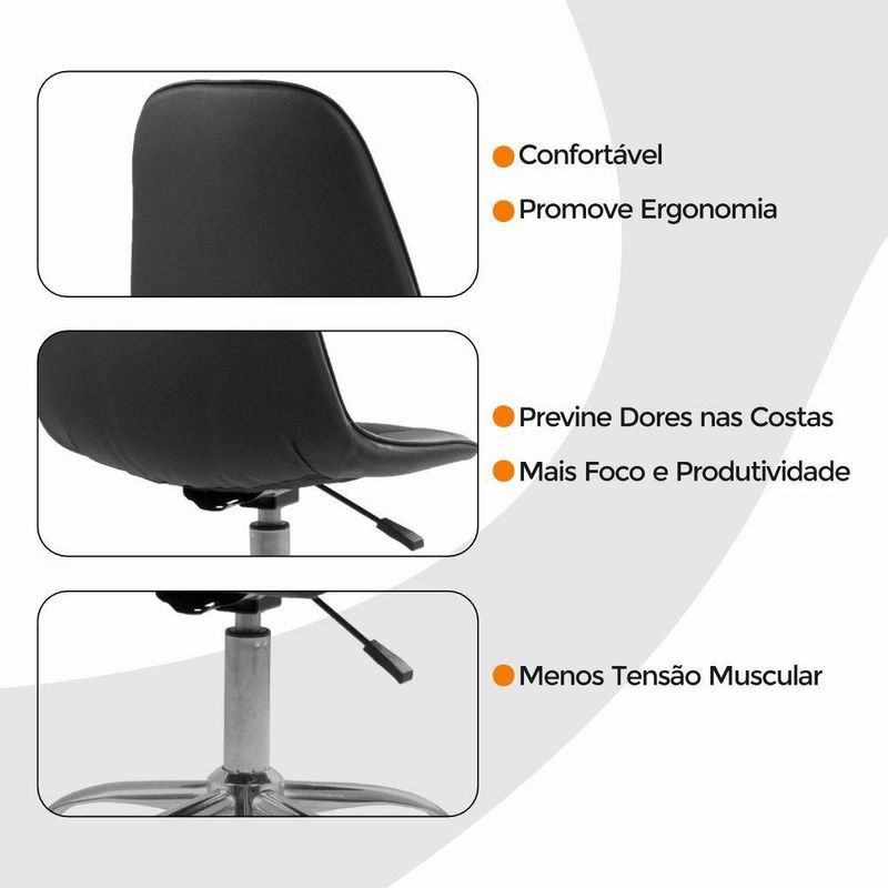 Kit 6 Cadeiras Office Eiffel Botonê Oficial Base PretoCadeira Office Eiffel Botonê Ajustável com Base Giratória – Design, Conforto e Versatilidade para o Seu EspaçoDescubra o equilíbrio ideal entre estilo moderno e conforto ergonômico com a Cadeira Office Eiffel Botonê Ajustável com Base Giratória.Desenvolvida para oferecer elegância e funcionalidade, ela é perfeita para escritórios, home offices, salas de estudo, áreas de lazer e ambientes comerciais.Seu design contemporâneo com estofamento botonê traz um toque sofisticado à decoração, enquanto o assento anatômico e o encosto ergonômico garantem conforto e postura correta mesmo durante longos períodos de uso.Com ajuste de altura e base giratória com rodízios, a Cadeira Eiffel Botonê proporciona mobilidade suave e personalização de uso, adaptando-se facilmente às suas necessidades diárias com praticidade e estilo.A montagem é simples e rápida — acompanha manual de instruções e suporte de atendimento especializado para qualquer dúvida. Diferenciais do ProdutoDesign Sofisticado e Ergonômico: Estilo botonê moderno com curvas anatômicas que garantem conforto e elegância.Ajuste de Altura Personalizado: Permite adaptar a cadeira ao seu biotipo e à altura da mesa.Base Giratória com Rodízios Cromados: Mobilidade fluida e estabilidade em qualquer superfície.Estrutura Resistente e Durável: Produzida em polipropileno (PP) e aço cromado de alta qualidade.Revestimento Premium: Material sintético (PU) de toque suave e fácil limpeza.Versatilidade de Uso: Ideal para ambientes corporativos e residenciais.Montagem Simples: Acompanha manual e suporte pós-venda especializado.Extras: acompanha e-book exclusivo. Especificações TécnicasModelo: Eiffel BotonêMarca: Oficial WebshopTipo de Cadeira: Office / GiratóriaMaterial da Estrutura: Polipropileno (PP) e Aço CromadoRevestimento: Material Sintético (PU)Assento e Encosto: Madeira multilaminada com acabamento botonêBase: Giratória com rodízios e regulagem de alturaPeso Máximo Suportado: 120 kgPeso da Cadeira: 5,5 kg Dimensões do ProdutoAltura Total (mín./máx.): 84,5 cm a 98 cmAltura do Assento (mín./máx.): 44,5 cm a 58 cmAltura do Encosto: 68 cmLargura do Assento: 43 cmProfundidade do Assento: 41 cmLargura da Base (pernas): 47,5 cmEspessura do Encosto: 5 cm Cuidados e ManutençãoLimpe com pano úmido e detergente neutro, evitando produtos abrasivos que possam danificar o acabamento.Evite exposição direta ao sol para preservar a cor, o brilho e a durabilidade do revestimento e da base cromada. Conforto e Estilo em Cada Detalhe!A Cadeira Office Eiffel Botonê Ajustável com Base Giratória combina ergonomia, resistência e elegância em um único design.Ideal para quem busca um ambiente funcional e sofisticado, ela transforma o seu espaço em um local mais confortável, moderno e inspirador.