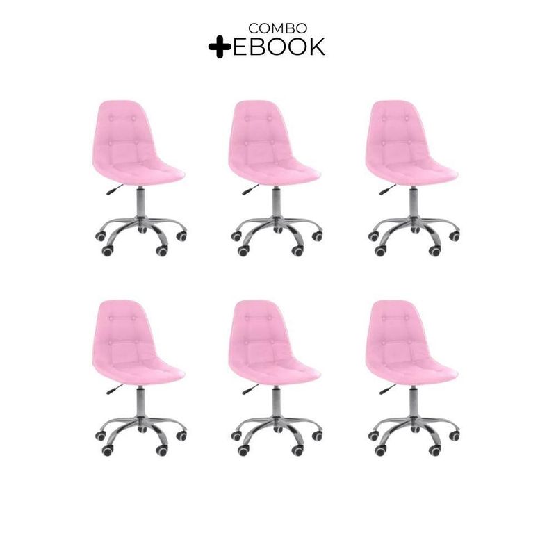 Kit 6 Cadeiras Office Eiffel Botonê Oficial Base RosaCadeira Office Eiffel Botonê Ajustável com Base Giratória – Design, Conforto e Versatilidade para o Seu EspaçoDescubra o equilíbrio ideal entre estilo moderno e conforto ergonômico com a Cadeira Office Eiffel Botonê Ajustável com Base Giratória.Desenvolvida para oferecer elegância e funcionalidade, ela é perfeita para escritórios, home offices, salas de estudo, áreas de lazer e ambientes comerciais.Seu design contemporâneo com estofamento botonê traz um toque sofisticado à decoração, enquanto o assento anatômico e o encosto ergonômico garantem conforto e postura correta mesmo durante longos períodos de uso.Com ajuste de altura e base giratória com rodízios, a Cadeira Eiffel Botonê proporciona mobilidade suave e personalização de uso, adaptando-se facilmente às suas necessidades diárias com praticidade e estilo.A montagem é simples e rápida — acompanha manual de instruções e suporte de atendimento especializado para qualquer dúvida. Diferenciais do ProdutoDesign Sofisticado e Ergonômico: Estilo botonê moderno com curvas anatômicas que garantem conforto e elegância.Ajuste de Altura Personalizado: Permite adaptar a cadeira ao seu biotipo e à altura da mesa.Base Giratória com Rodízios Cromados: Mobilidade fluida e estabilidade em qualquer superfície.Estrutura Resistente e Durável: Produzida em polipropileno (PP) e aço cromado de alta qualidade.Revestimento Premium: Material sintético (PU) de toque suave e fácil limpeza.Versatilidade de Uso: Ideal para ambientes corporativos e residenciais.Montagem Simples: Acompanha manual e suporte pós-venda especializado.Extras: acompanha e-book exclusivo. Especificações TécnicasModelo: Eiffel BotonêMarca: Oficial WebshopTipo de Cadeira: Office / GiratóriaMaterial da Estrutura: Polipropileno (PP) e Aço CromadoRevestimento: Material Sintético (PU)Assento e Encosto: Madeira multilaminada com acabamento botonêBase: Giratória com rodízios e regulagem de alturaPeso Máximo Suportado: 120 kgPeso da Cadeira: 5,5 kg Dimensões do ProdutoAltura Total (mín./máx.): 84,5 cm a 98 cmAltura do Assento (mín./máx.): 44,5 cm a 58 cmAltura do Encosto: 68 cmLargura do Assento: 43 cmProfundidade do Assento: 41 cmLargura da Base (pernas): 47,5 cmEspessura do Encosto: 5 cm Cuidados e ManutençãoLimpe com pano úmido e detergente neutro, evitando produtos abrasivos que possam danificar o acabamento.Evite exposição direta ao sol para preservar a cor, o brilho e a durabilidade do revestimento e da base cromada. Conforto e Estilo em Cada Detalhe!A Cadeira Office Eiffel Botonê Ajustável com Base Giratória combina ergonomia, resistência e elegância em um único design.Ideal para quem busca um ambiente funcional e sofisticado, ela transforma o seu espaço em um local mais confortável, moderno e inspirador.
