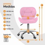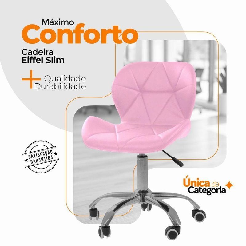 Kit 6 Cadeiras Office Eiffel Slim Ajustável Oficial RosaCadeira Office Eiffel Slim Base Giratória – Design, Versatilidade e Conforto para o Seu EspaçoDescubra o equilíbrio ideal entre modernidade, ergonomia e sofisticação com a Cadeira Office Eiffel Slim Base Giratória.Projetada para proporcionar conforto e estilo, ela se adapta facilmente a qualquer ambiente— seja escritório, home office, sala de jantar ou espaço comercial — oferecendo funcionalidade e elegância em cada detalhe.Com assento anatômico revestido em couro sintético e estrutura em polipropileno de alta resistência, a Eiffel Slim alia durabilidade e design contemporâneo. Sua base cromada com rodízios e ajuste de altura garante mobilidade suave e personalização de uso, tornando suas horas de trabalho ou estudo muito mais agradáveis.A montagem é prática e acompanha manual de instruções e suporte de atendimento especializado para qualquer dúvida. Diferenciais do ProdutoDesign Sofisticado: Visual moderno que combina com qualquer ambiente residencial ou corporativo.Estrutura Robusta: Produzida em polipropileno e aço cromado para maior resistência e durabilidade.Ajuste de Altura: Permite personalizar a posição ideal para o seu conforto e ergonomia.Base Giratória com Rodízios: Facilita a movimentação e proporciona praticidade no dia a dia.Revestimento Premium: Couro sintético de toque macio e acabamento refinado.Montagem Simples: Acompanha manual e suporte pós-venda especializado.Extras: acompanha e-book exclusivo. Especificações TécnicasModelo: Eiffel SlimMarca: Oficial WebshopTipo de Cadeira: Office / GiratóriaMaterial da Estrutura: Polipropileno e Aço CromadoRevestimento: Couro Sintético (PU)Assento: Madeira multilaminada revestidaBase: Giratória cromada com rodíziosPeso Máximo Suportado: 120 kgPeso da Cadeira: 6 kg Dimensões do ProdutoAltura Total (mín./máx.): 72 cm a 85,5 cmAltura do Assento (mín./máx.): 43 cm a 56,5 cmAltura do Encosto: 42 cmLargura do Assento: 48 cmProfundidade do Assento: 36,5 cmLargura Total (base): 47,5 cm Cuidados e ManutençãoLimpe com pano úmido e detergente neutro, evitando produtos abrasivos que possam danificar o revestimento.Evite exposição direta ao sol para preservar a cor e o brilho do couro sintético e da base cromada. Conforto e Estilo para o Seu Dia a Dia!A Cadeira Office Eiffel Slim Base Giratória é a combinação perfeita entre design contemporâneo e praticidade.Ideal para quem valoriza ambientes elegantes e funcionais, ela oferece conforto, resistência e versatilidade para qualquer espaço.