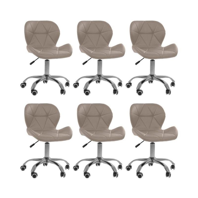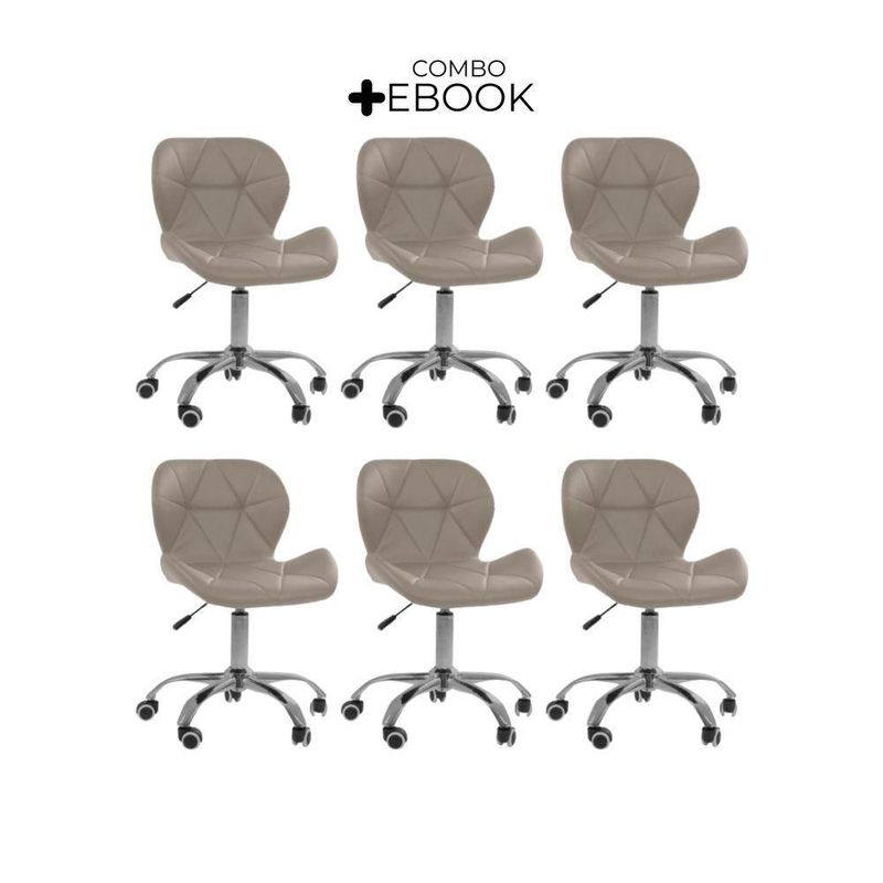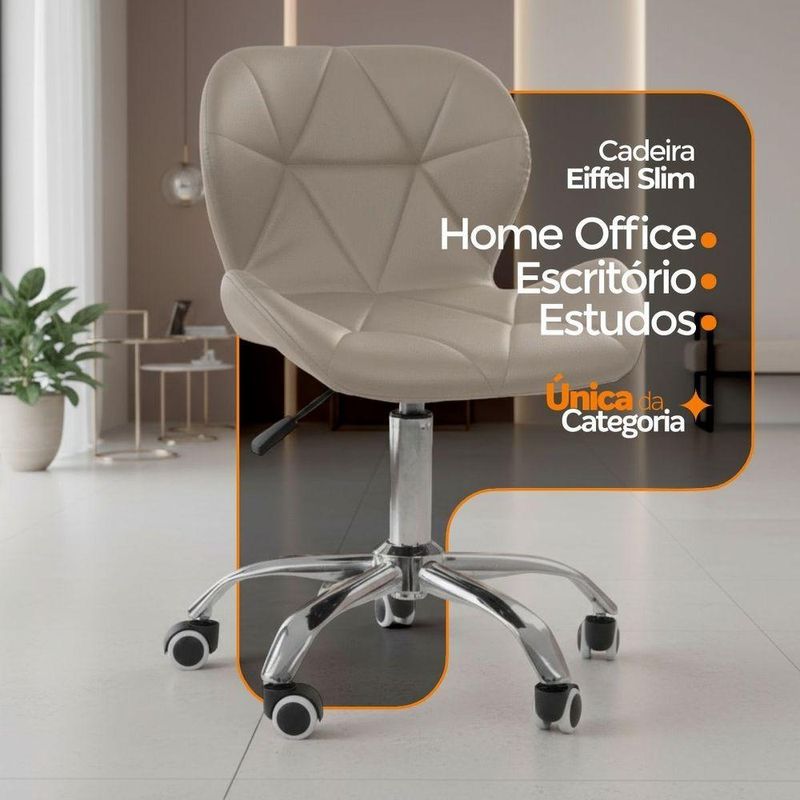 Kit 6 Cadeiras Office Eiffel Slim Oficial Giratória BegeCadeira Office Eiffel Slim Base Giratória – Design, Versatilidade e Conforto para o Seu EspaçoDescubra o equilíbrio ideal entre modernidade, ergonomia e sofisticação com a Cadeira Office Eiffel Slim Base Giratória.Projetada para proporcionar conforto e estilo, ela se adapta facilmente a qualquer ambiente— seja escritório, home office, sala de jantar ou espaço comercial — oferecendo funcionalidade e elegância em cada detalhe.Com assento anatômico revestido em couro sintético e estrutura em polipropileno de alta resistência, a Eiffel Slim alia durabilidade e design contemporâneo. Sua base cromada com rodízios e ajuste de altura garante mobilidade suave e personalização de uso, tornando suas horas de trabalho ou estudo muito mais agradáveis.A montagem é prática e acompanha manual de instruções e suporte de atendimento especializado para qualquer dúvida.Diferenciais do ProdutoDesign Sofisticado: Visual moderno que combina com qualquer ambiente residencial ou corporativo.Estrutura Robusta: Produzida em polipropileno e aço cromado para maior resistência e durabilidade.Ajuste de Altura: Permite personalizar a posição ideal para o seu conforto e ergonomia.Base Giratória com Rodízios: Facilita a movimentação e proporciona praticidade no dia a dia.Revestimento Premium: Couro sintético de toque macio e acabamento refinado.Montagem Simples: Acompanha manual e suporte pós-venda especializado.Extras: acompanha e-book exclusivo.Especificações TécnicasModelo: Eiffel SlimMarca: Oficial WebshopTipo de Cadeira: Office / GiratóriaMaterial da Estrutura: Polipropileno e Aço CromadoRevestimento: Couro Sintético (PU)Assento: Madeira multilaminada revestidaBase: Giratória cromada com rodíziosPeso Máximo Suportado: 120 kgPeso da Cadeira: 6 kgDimensões do ProdutoAltura Total (mín./máx.): 72 cm a 85,5 cmAltura do Assento (mín./máx.): 43 cm a 56,5 cmAltura do Encosto: 42 cmLargura do Assento: 48 cmProfundidade do Assento: 36,5 cmLargura Total (base): 47,5 cmCuidados e ManutençãoLimpe com pano úmido e detergente neutro, evitando produtos abrasivos que possam danificar o revestimento.Evite exposição direta ao sol para preservar a cor e o brilho do couro sintético e da base cromada.Conforto e Estilo para o Seu Dia a Dia!A Cadeira Office Eiffel Slim Base Giratória é a combinação perfeita entre design contemporâneo e praticidade.Ideal para quem valoriza ambientes elegantes e funcionais, ela oferece conforto, resistência e versatilidade para qualquer espaço.
