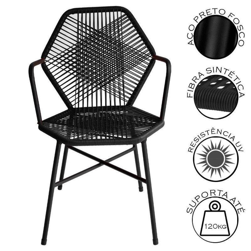 Kit 6 Cadeiras Tropicália Fibra Sintética Gourmet Acesse Móveis PretoA Cadeira Tropicalia combina design sofisticado e resistencia para compor ambientes com estilo e conforto.Produzida em aco com pintura eletrostatica e fibra sintetica trancada a mao, e ideal para areas gourmet, varandas cobertas, ediculas e espacos de lazer, oferecendo leveza, praticidade e visual elegante para o seu ambiente.Alem do visual refinado, a estrutura metalica proporciona alta durabilidade, enquanto a fibra sintetica e facil de limpar e mantem o conforto mesmo em dias quentes.Por ser feita em aco, nao recomendamos deixar exposta diretamente a chuva ou em jardins totalmente abertos, para preservar sua durabilidade e acabamento.Caracteristicas:Estrutura em aco com pintura eletrostatica, resistente e duravelAcabamento em fibra sintetica trancada artesanalmente, com visual sofisticadoIndicada para areas gourmet, varandas cobertas, ediculas e areas de lazerVai montada, pronta para usoSuporta ate 120 kgItens Inclusos:06 Cadeiras Tropicalia Fibra Sintetica para Area GourmetDimensoes da Cadeira (Individualmente):Altura: 85 cmAltura ate o assento: 45 cmLargura: 57 cmProfundidade: 55 cmPeso: 4 kgGarantia de 3 Meses contra defeitos de fabricacao.