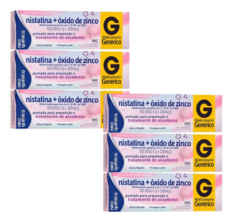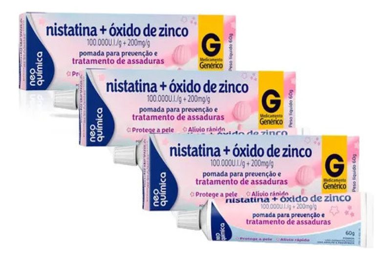 Nistatina Óxido De Zinco - Kit com 6 Unidades 60g A Nistatina + Óxido de Zinco é um tratamento tópico eficaz para assaduras e outras condições cutâneas causadas por fungos. Cada kit contém 6 unidades, ideal para garantir o cuidado contínuo da pele delicada do seu bebê ou das áreas afetadas. Instruções de Uso Para Assaduras: Após o banho e a cada troca de fraldas, limpe cuidadosamente a pele para remover resíduos de urina ou fezes. Se houver apenas urina, lave a área com água morna. Em caso de fezes, use água morna e sabonete de glicerina ou um sabonete suave para bebês, enxaguando bem. Seque a pele delicadamente com uma toalha macia, evitando esfregar excessivamente. Aplique uma camada fina de Nistatina + Óxido de Zinco em toda a região coberta pela fralda. Para Outras Indicações (Intertrigos e Paroníquias): Aplique duas ou mais vezes ao dia nas áreas afetadas. Dicas de Higiene: Lave as toalhas do bebê e fraldas de pano com sabão de coco e enxágue abundantemente.Evite usar amaciantes de roupas ou outros produtos químicos. Contraindicação Contraindicado em casos de hipersensibilidade à nistatina, ao óxido de zinco ou aos demais ingredientes do produto. Indicações A Nistatina + Óxido de Zinco é indicada principalmente para o tratamento de assaduras infantis (dermatite das fraldas e dermatite amoniacal). Também é eficaz no tratamento de: Intertrigos (mamário, perineal, interdigital, axilar ou outros) Paroníquias por fungos do gênero Candida Códigos CID: L22 – Dermatite das fraldas L30.4 – Intertrigos eritematosos B37.2 – Candidíase da pele e unhas Este produto oferece uma solução segura e eficaz para proteger e tratar a pele sensível do seu bebê, promovendo alívio e cura rápidos.