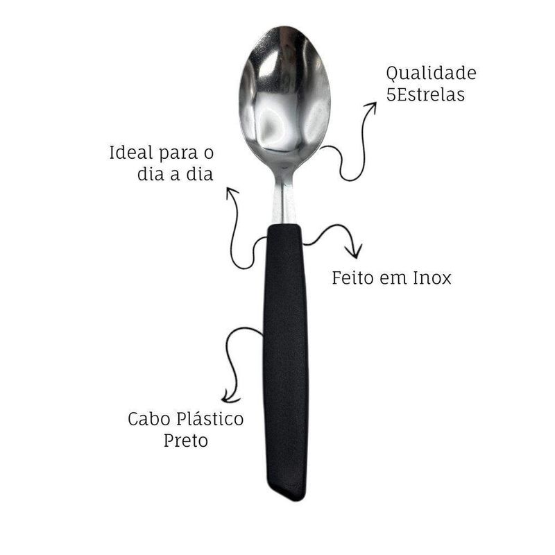 Kit 6 Peças Colher De Mesa Cabene Cabo Plástico PretoKit com 6 colheres de mesa Cabene com cabo plástico preto- Colheres resistentes para uso diário- Cabo plástico leve e fácil de segurar- Conjunto ideal para complementar talheres da casa- Acabamento preto que combina com qualquer mesaEspecificações do produto:Quantidade: 6 colheres de mesaMaterial: Inox com cabo plásticoDimensões da embalagem:Altura: 1 cmLargura: 8 cmComprimento: 24 cmPeso total: 0,138 kgCor: PretoTipo: Colheres de mesa com cabo plásticoKit com 6 colheres de mesa Cabene com cabo plástico preto- Colheres resistentes para uso diário- Cabo plástico leve e fácil de segurar- Conjunto ideal para complementar talheres da casa- Acabamento preto que combina com qualquer mesaEspecificações do produto:Quantidade: 6 colheres de mesaMaterial: Inox com cabo plásticoDimensões da embalagem:Altura: 1 cmLargura: 8 cmComprimento: 24 cmPeso total: 0,138 kgCor: PretoTipo: Colheres de mesa com cabo plástico